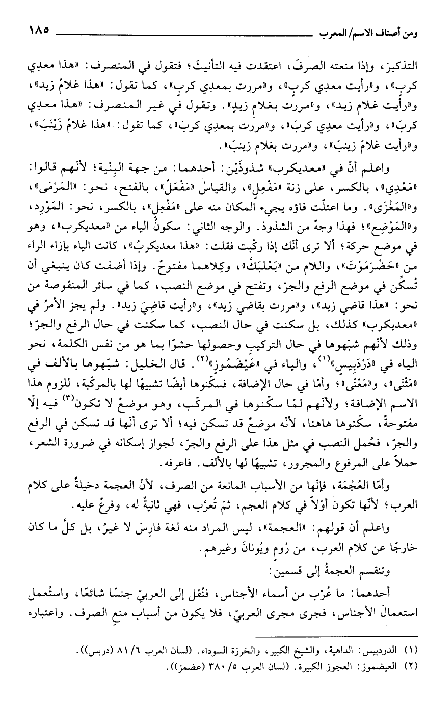 التذكيرَ، وإذا منعته الصرفَ، اعتقدت فيه التأنيثَ؛ فتقول في المنصرف: "هذا معدِي كرب"، و"رأيت معدِي كربٍ"، و"مررت بمعدِي كرب"، كما تقول: "هذا غلامُ زيد"، و"رأيت غلام زيد"، و"مررت بغلامِ زيدٍ". وتقول في غير المنصرف: "هذا معدِي كربَ"، و"رأيت معدِي كربَ"، و"مررت بمعدِي كربَ"، كما تقول: "هذا غلامُ زَيْنَبَ"، و"رأيت غلامَ زينبَ"، و"مررت بغلام زينبَ".