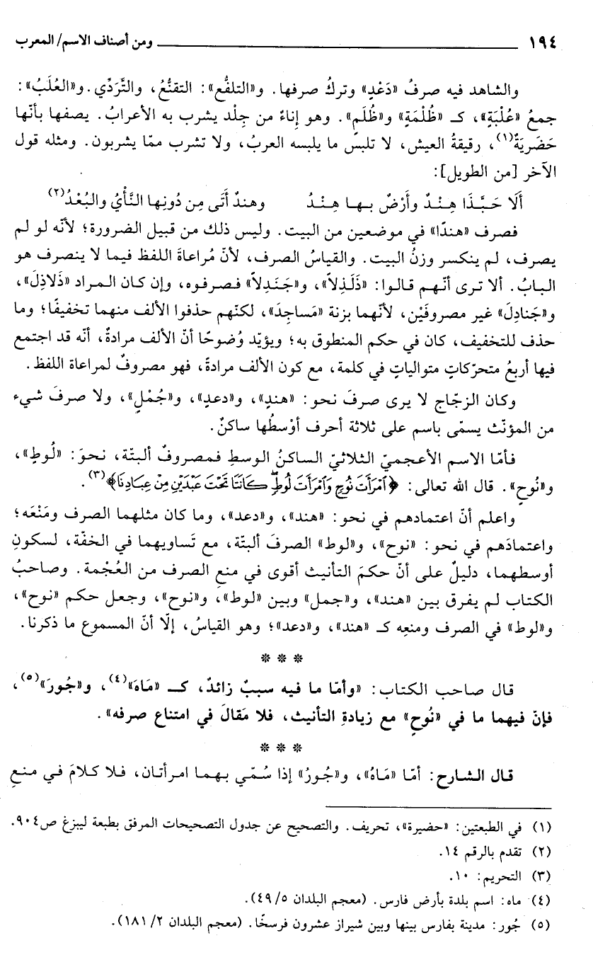 واعلم أنّ اعتمادهم في نحو: "هند"، و"دعد"، وما كان مثلهما الصرف ومَنْعَه؛ واعتمادَهم في نحو: "نوح"، و"لوط" الصرفَ ألبتّة، مع تَساويهما في الخفّة، لسكونِ أوسطهما، دليلٌ على أن حكمَ التأنيث أقوى في منعِ الصرف من العُجْمة. وصاحبُ الكتاب لم يفرق بين "هند", و"جمل"وبين "لوط", و"نوح", وجعل حكم"نوح", و"لوط" في الصرف ومنعهِ كـ "هند","دعد"؛ وهو القياسُ ,إلاَ أن المسموع ما ذكرنا.
