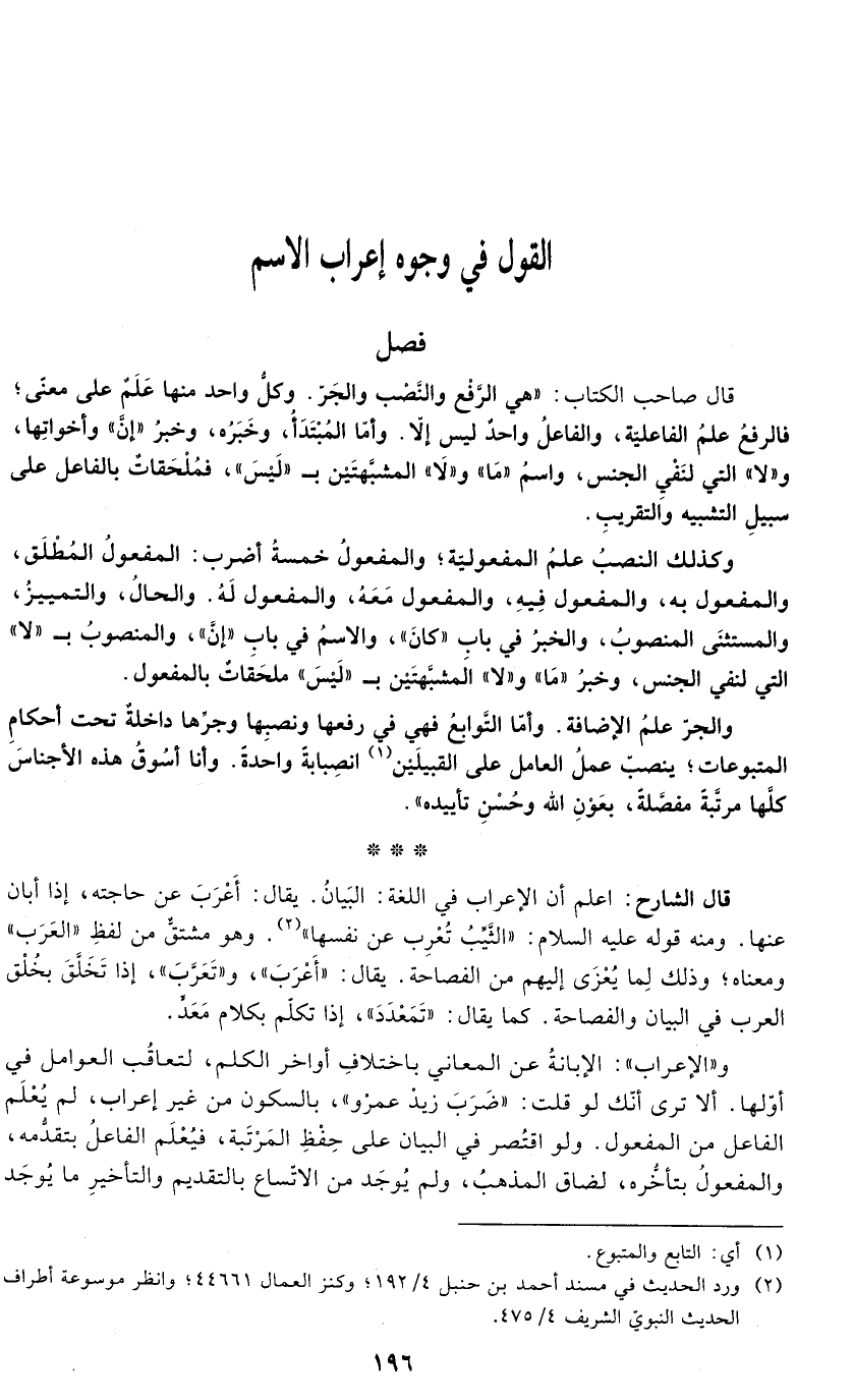 قال الشارح: اعلم أن الإعراب في اللغة: البَيانُ. يقال: أَعْرَبَ عن حاجته، إذا أبان عنها. ومنه قوله عليه السلام: "الثَّيِّبُ تُعْرِب عن نفسها" (¬2). وهو مشتقٌّ من لفظِ "العَرَب" ومعناه؛ وذلك لِما يُعْزَى إليهم من الفصاحة. يقال: "أَعْرَبَ"، و"تَعَرَّبَ"، إذا تَخَلَّقَ بخُلْق العرب في البيان والفصاحة. كما يقال: "تَمَعْدَدَ"، إذا تكلّم بكلام مَعَدّ.