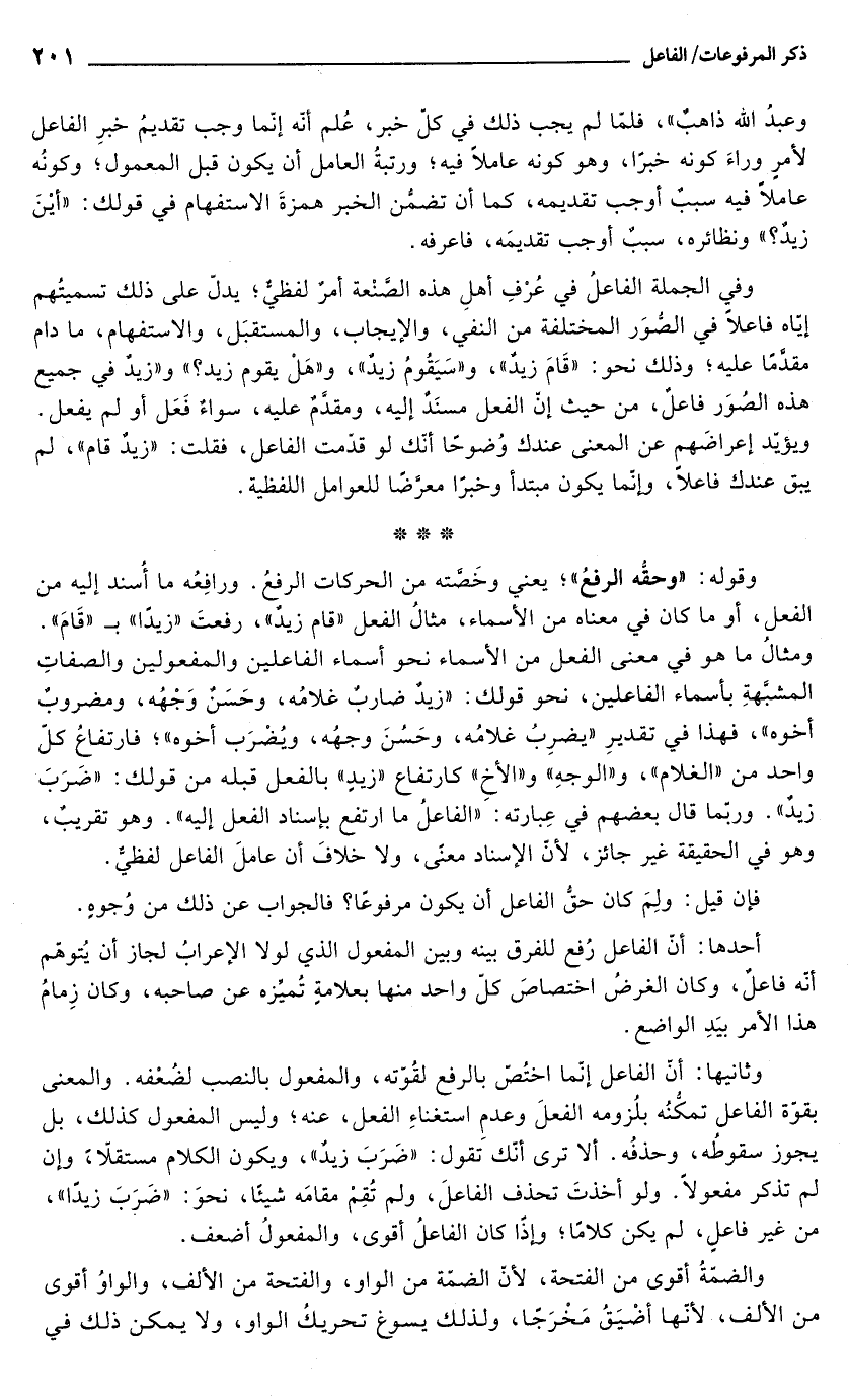 وفي الجملة الفاعلُ في عُرْفِ أهلِ هذه الصَّنْعة أمر لفظيٌّ؛ يدل على ذلك تسميتُهم إيّاه فاعلاً في الصُّوَر المختلفة من النفي، والإيجاب، والمستقبَل، والاستفهام، ما دام مقدَّمًا عليه؛ وذلك نحو: "قَامَ زيدٌ"، و"سَيَقُومُ زيدٌ"، و"هَلْ يقوم زيد؟ " و"زيدٌ في جميع هذه الصُوَر فاعلٌ، من حيث إنّ الفعل مسنَدٌ إليه، ومقدَّمٌ عليه، سواءٌ فَعَل أو لم يفعل. ويؤيّد إعراضَهم عن المعنى عندك وُضوحًا أنّك لو قدّمت الفاعل، فقلت: "زيدٌ قام"، لم يبق عندك فاعلًا، وإنمّا يكون مبتدأ وخبرًا معرّضًا للعوامل اللفظية.