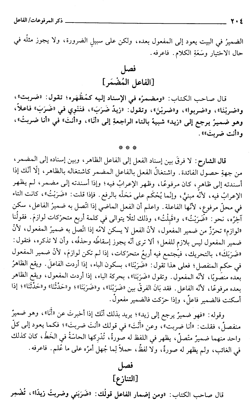 قال الشارح: لا فرقَ بين إسناد الفعل إلى الفاعل الظاهر، وبين إسناده إلى المضمر، من جهةِ حصول الفائدة. واشتغالُ الفعل بالفاعل المضمر كاشتغاله بالظاهر، إلَّا أنّك إذا أسندته إلى ظاهرٍ، كان مرفوعًا، وظهر الإعرابُ فيه؛ وإذا أسندته إلى مضمر، لم يظهر الإعرابُ فيه, لأنّه مبنيٌّ، وإنّما يُحْكَم على مَحَلّه بالرفع. فإذا قلت: "ضَرَبْتُ"، كانت التاء في محلّ مرفوع, لأنهّا الفاعلة. واعلم أن الفعل الماضي إذا اتّصل به ضميرُ الفاعل، سكن آخِرُه، نحو: "ضَرَبْتُ"، و"قَبِلْتُ"، وذلك لئلاّ يتوالى في كلمة أربع متحرّكات لوازمَ. فقولُنا "لوازم " تحرّزٌ من ضمير المفعول, لأنّ الفعل لا يسكن لامُه إذا اتّصل به ضميرُ المفعول, لأن ضمير المفعول ليس بلازم للفعل؛ ألا ترى أنّه يجوز إسقاطُه وحذفُه، وأن لا تذكره، فتقول: "ضَرَبَكَ"، بالتحريك، فيجتمع فيه أربعُ متحرّكات، إذا لم تكن لوازمَ, لأن ضمير المفعول في حكمِ المنفصل؛ فعلى هذا تقول: "ضَرَبْنَا"، بسكون الباء، إذا أردت الفاعلَ. ويقع الظاهرُ بعده منصوبًا, لأنّه المفعوَل. وتقول "ضَرَبَنَا"، بحركة الباء، إذا أردت المفعول، ويقع الظاهر بعده مرفوعًا، لائه الفاعل. فقد بَانَ الفرقُ بين "ضَرَبْنَا"، و"ضَرَبَنَا"؛ و"حَدثنا" و"حَدثَنَا"؛ إذا أسكنت فالضمير فاعلٌ، وإذا حرّكت فالضمير مفعولٌ.