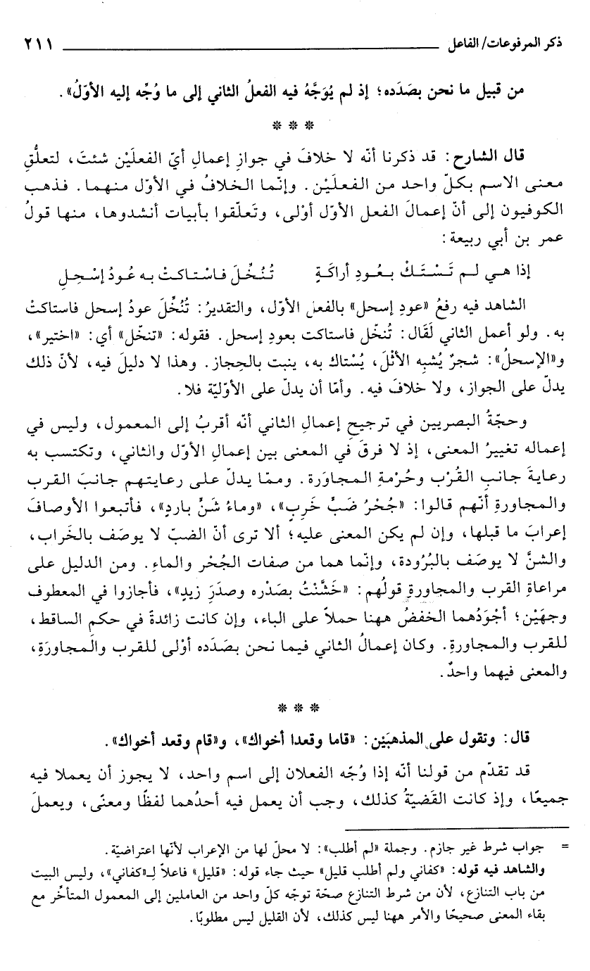 قال الشارح: قد ذكرنا أنّه لا خلافَ في جوازِ إعمالِ أيّ الفعلَيْن شئتَ، لتعلُّقِ معنى الاسم بكلّ واحد من الفعلَيْن. وإنّما الخلافُ في الأوّل منهما. فذهب الكوفيون إلى أنّ إعمالَ الفعل الأول أوْلى، وتَعلّقوا بأبيات أنشدوها، منها قولُ عمر بن أبي ربيعة:
