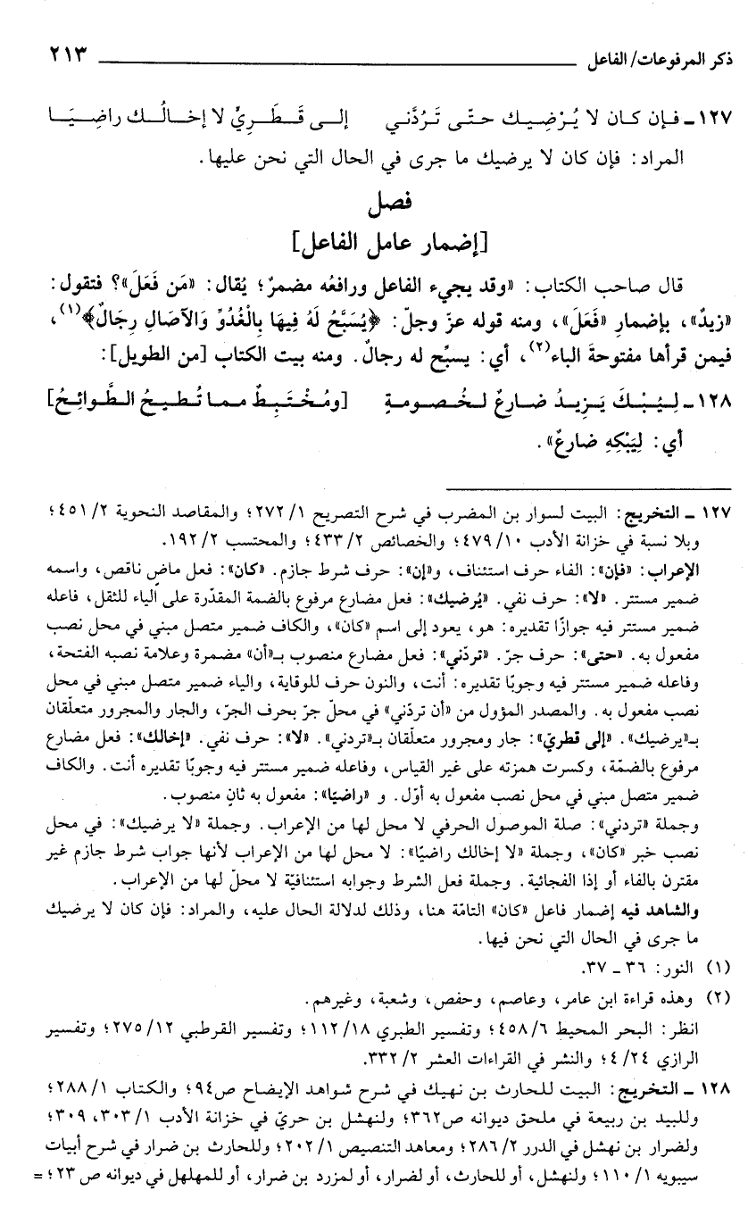 127 - التخريج: البيت لسوار بن المضرب في شرح التصريح 1/ 272؛ والمقاصد النحوية 2/ 451؛ وبلا نسبة في خزانة الأدب 10/ 479؛ والخصائص 2/ 433؛ والمحتسب 2/ 192.