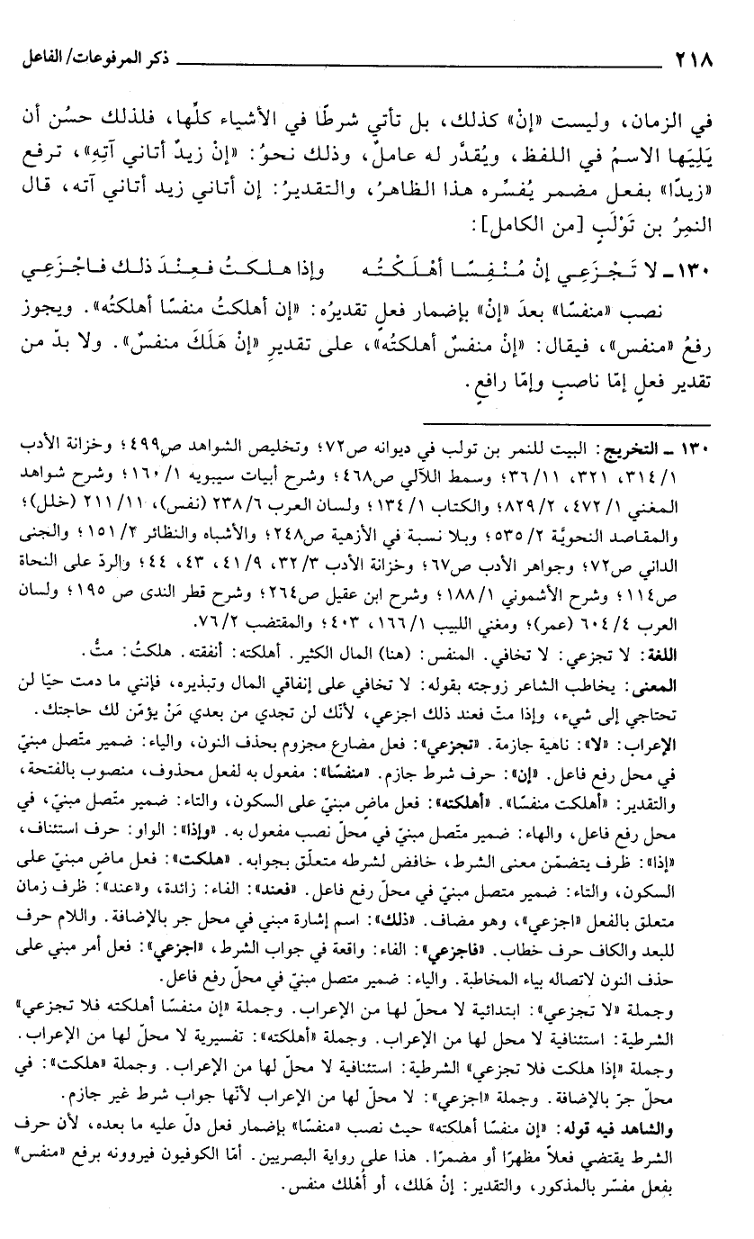 والشاهد فيه قوله: "إن منفسًا أهلكته" حيث نصب "منفسًا" بإضمار فعل دلّ عليه ما بعده, لأن حرف الشرط يقتضي فعلًا مظهرًا أو مضمرًا. هذا علي رواية البصريين. أمّا الكوفيون فيروونه برفع "منفس" بفعل مفسّر بالمذكور، والتقدير: إنْ هَلك، أو أهْلك منفس.