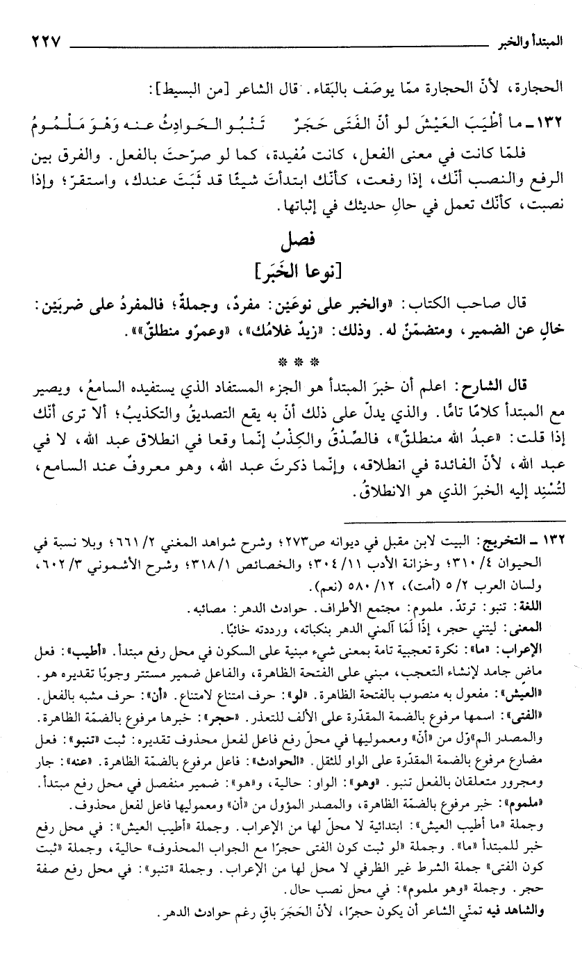الإعراب: "ما": نكرة تعجبية تامة بمعنى شيء مبنية على السكون في محل رفع مبتدأ. "أطيب": فعل ماضٍ جامد لإنشاء التعجب، مبني على الفتحة الظاهرة، والفاعل ضمير مستتر وجوبًا تقديره هو. "العيش": مفعول به منصوب بالفتحة الظاهرة. "لو": حرف امتناع لامتناع. "أن": حرف مشبه بالفعل. "الفتى": اسمها مرفوع بالضمة المقدّرة على الألف للتعذر. "حجر": خبرها مرفوع بالضمّة الظاهرة. والمصدر الم" وّل من "أنّ" ومعموليها في محلّ رفع فاعل لفعل محذوف تقديره: ثبت "تنبو": فعل مضارع مرفوع بالضمة المقدّرة على الواو للثقل. "الحوادث": فاعل مرفوع بالضمّة الظاهرة. "عنه": جار ومجرور متعلقان بالفعل تنبو."هو": الواو: حالية، و"هو": ضمير منفصل في محل رفع مبتدأ. "ملموم": خبر مرفوع بالضمّة الظاهرة، والمصدر المؤول من "أن" ومعموليها فاعل لفعل محذوف.