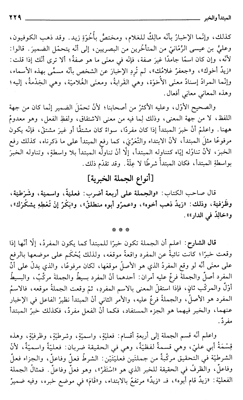 واعلم أنّه قسم الجملة إلى أربعةِ أقسام: فعليّةٍ، واسميّةٍ، وشرطيةِ، وظرفيّةٍ, وهذه قِسْمَةُ أبي عليّ، وهي قسمةٌ لفظيّةٌ، وهي في الحقيقة ضربان: فعليّةٌ واسميّةٌ, لأنّ الشرطيّة في التحقيق مركَّبةٌ من جملتَين فعليّتَيْن: الشرطُ فعلٌ وفاعلٌ، والجزاء فعلٌ وفاعلٌ، والظرفُ في الحقيقة للخبر الذي هو "اسْتَقَرَّ"، وهو فعل وفاعلٌ. فمثالُ الجملة الفعليّة: "زيدٌ قام أبوه"، فـ "زيدٌ" مرتفعٌ بالابتداء، و"قَامَ" في موضع خبره، وفيه ضميرٌ