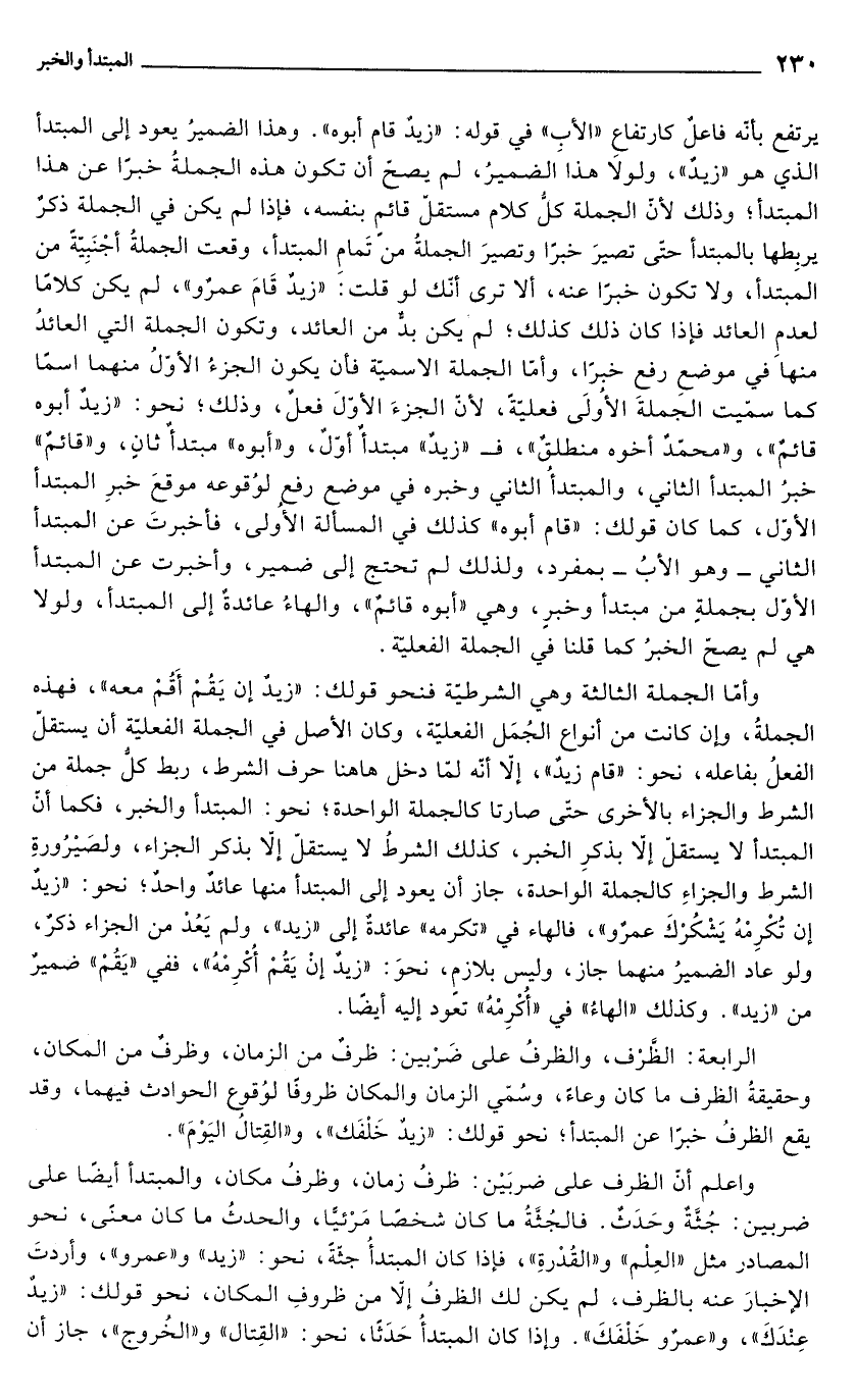 يرتفع بأنّه فاعلٌ كارتفاع "الأبِ" في قوله: "زيدٌ قام أبوه". وهذا الضميرُ يعود إلى المبتدأ الذي هو "زيدٌ"، ولولَا هذا الضميرُ، لم يصح أن تكون هذه الجملةُ خبرًا عن هذا المبتدأ؛ وذلك لأنّ الجملة كلُّ كلام مستقلّ قائم بنفسه، فإذا لم يكن في الجملة ذكر يربِطها بالمبتدأ حتّى تصيرَ خبرًا وتصيرَ الجملةُ من تَمامِ المبتدأ، وقعت الجملةُ أجْنَبِيّةً من المبتدأ، ولا تكون خبرًا عنه، ألا ترى أنّك لو قلت: "زيدٌ قَامَ عمرٌو"، لم يكن كلامًا لعدمِ العائد فإذا كان ذلك كذلك؛ لم يكن بدٌّ من العائد، وتكون الجملة التي العائدُ منها في موضع رفع خبرًا، وأمّا الجملة الاسميّة فأن يكون الجزءُ الأوّلُ منهما اسمًا كما سمّيت الجَملةَ الأوُلَى فعليةً, لأنّ الجزءَ الأوّلَ فعلٌ، وذلك؛ نحو: "زيدٌ أبوه قائمٌ"، و"محمّدٌ أخوه منطلقٌ"، فـ "زيدٌّ" مبتدأ أولٌ، و"أبوه" مبتدأٌ ثانٍ، و"قائمٌ" خبرُ المبتدأ الثاني، والمبتدأُ الثاني وخبره في موضع رفع لوُقوعه موقعَ خبرِ المبتدأ الأوّل، كما كان قولك: "قام أبوه" كذلك في المسألة الأوُلى، فأخبرتَ عن المبتدأ الثاني - وهو الأبُ - بمفرد، ولذلك لم تحتج إلى ضمير، وأخبرت عن المبتدأ الأوّل بجملةٍ من مبتدأ وخبرِ، وهي "أبوه قائمٌ"، والهاءُ عائدةٌ إلى المبتدأ، ولولا هي لم يصح الخبرُ كما قلنا في الجملة الفعليّة.