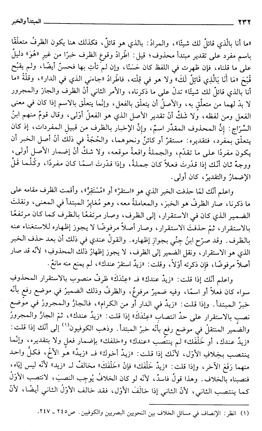 واعلم أنّك إذا قلت: "زيدٌ عندك" فـ "عِنْدَكَ" ظرفٌ منصوب بالاستقرار المحذوفِ سواء كان فعلاً أو اسمًا، وفيه ضميرٌ مرفوعٌ، والظرفُ وذلك الضميرُ في موضع رفعٍ بأنّه خبرُ المبتدأ. وإذا قلت: "زيدٌ في الدار أو من الكرام"، فالجارُّ والمجرورُ في موضع نصب بالاستقرار على حد انتصابِ "عِنْدَكَ" إذا قلت: "زيدٌ عندك"، ثمّ الجارُّ والمجرورُ والضمير المنتقلُ في موضع رفعٍ بأَنّه خبرُ المبتدأ. وذهب الكوفيون (¬1) إلى أنّك إذا قلت: "زيدٌ عندك، أو خَلْفَك" لم ينتصب "عندك" و"خلفك" بإضمار فعلٍ ولا بتقديره، وإنّما ينتصب بخِلافِ الأوّل، لأنّك إذا قلت: "زيدٌ أخوك" فـ "زيدٌ" هو الأخُ، فكلُّ واحد منهما رَفَعَ الآخر، وإذا قلت: "زيدٌ خَلْفَك" فإن "خَلْفَكَ" مخالفٌ لـ "زيدٌ" لأنّه ليس إيّاه، فنصبناه بالخلاف. وهذا قولٌ فاسد, لأنّه لو كان الخلافُ يُوجِب النصبَ، لانتصب الأوّلُ كما ينتصب الثاني, لأنّ الثاني إذا خالَفَ الأوّل، فقد خالف الأوّلُ الثاني أيضًا, لأنّ