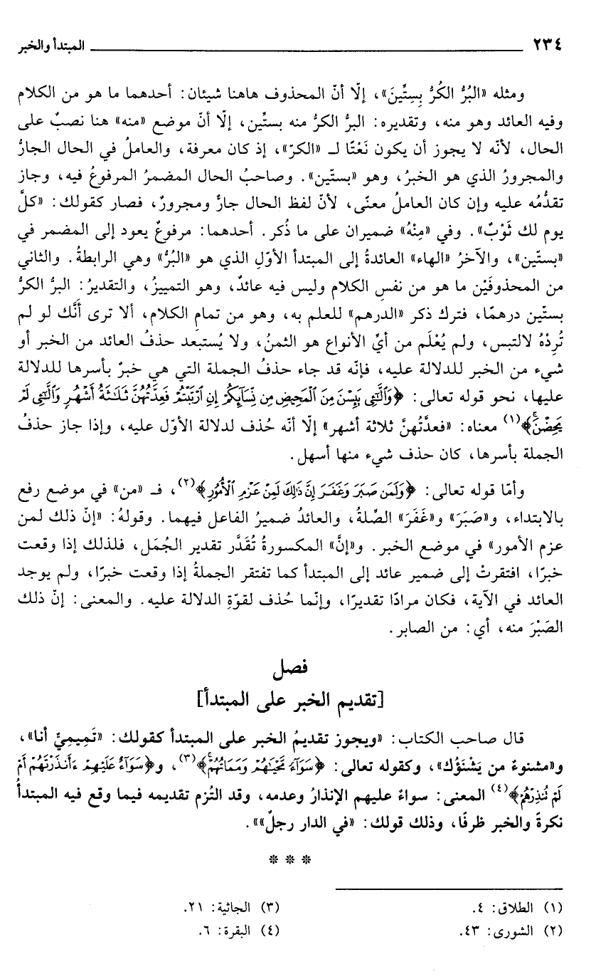 قال صاحب الكتاب: "ويجوز تقديم الخبر على المبتدأ كقولك تميميٌّ أنا، ومشنوءٌ من يشنؤك"، وكقوله تعالى: {سَوَاءً مَحْيَاهُمْ وَمَمَاتُهُمْ} (¬3) , و {وَسَوَاءٌ عَلَيْهِمْ أَأَنْذَرْتَهُمْ أَمْ لَمْ تُنْذِرْهُمْ} (¬4)، المعنى سواء عليهم الإنذار وعدمه. وقد التزم تقديمه فيما وقع فيه المبتدأ نكرةً والخبر ظرفًا وذلك قولك: "في الدار رجلٌ".