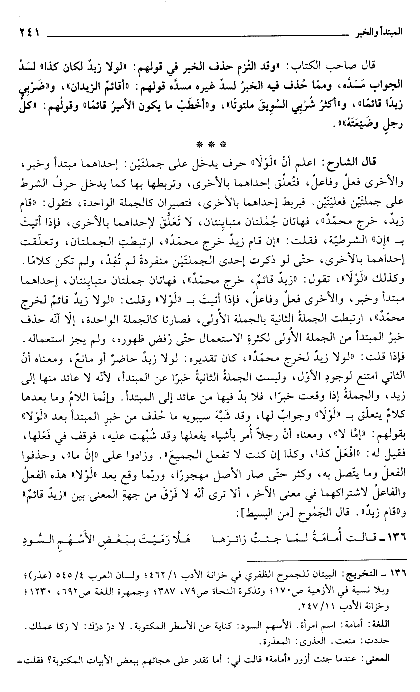 قال الشارح: اعلم أنّ "لَوْلَا" حرف يدخل على جملتَيْن: إحداهما مبتدأ وخبر، والأخرى فعلٌ وفاعلٌ، فتُعلِّق إحداهما بالأخرى، وتربطها بها كما يدخل حرفُ الشرط على جملتَيْن فعليتَيْن. فيربط إحداهما بالأخرى، فتصيران كالجملة الواحدة، فتقول: "قام زيدٌ، خرج محمّدٌ"، فهاتان جملتان متبايِنتان، لا تَعَلُّقَ لإحداهما بالأخرى، فإذا أتيتَ بـ "إِن" الشرطيّة، فقلت: "إن قام زيدٌ خرج محمّدٌ"، ارتبطتِ الجملتان، وتعلقت إحداهما بالأخرى، حتى لو ذكرت إحدى الجملتَيْن منفردةً لم تُفِدْ، ولم تكن كلامًا. وكذلك "لَوْلَا"، تقول: "زيدٌ قائمٌ، خرج محمّدٌ"، فهاتان جملتان متبايِنتان، إحداهما مبتدأ وخبر، والأخرى فعلٌ وفاعلٌ، فإذا أتيتَ بـ "لَوْلا" وقلت: "لولا زيدٌ قائمٌ لخرج محمَّدٌ"، ارتبطت الجملةُ الثانية بالجملة الأُولى، فصارتا كالجملة الواحدة، إلَّا أنّه حذف خبرُ المبتدأ من الجملة الأوُلى لكثرةِ الاستعمال حتى رُفض ظهوره، ولم يجز استعماله. فإذا قلت: "لولا زيدٌ لخرج محمدٌ"، كان تقديره: لولا زيدٌ حاضرٌ أو مانعٌ، ومعناه أن الثاني امتنع لوجودِ الأوّل، وليست الجملةُ الثانيةُ خبرًا عن المبتدأ, لأنه لا عائد منها إلى زيدٌ، والجملةُ إذا وقعت خبرًا، فلا بدّ فيها من عائد إلى المبتدأ. وإنما اللامُ وما بعدها كلامٌ يتعلّق بـ "لَوْلَا" وجوابٌ لها، وقد شَبَّهَ سيبويه ما حُذف من خبرِ المبتدأ بعد "لَوْلا" بقولهم: "إمَّا لا"، ومعناه أن رجلاً أُمر بأشياء يفعلها وقد شُبِّهت عليه، فوقف في فَعْلها، فقيل له: "افْعَلْ كذا، وكذا إن كنت لا تفعل الجميعَ". وزادوا على "إنْ ما"، وحذفوا الفعلَ وما يتّصل به، وكثر حتّى صار الأصل مهجورًا، وربمّا وقع بعد "لَوْلا" هذه الفعلُ والفاعلُ لاشتراكهما في معنى الآخر، ألا ترى أنّه لا فَرْقَ من جهةِ المعنى بين "زيدٌ قائمٌ " و"قام زيدٌ". قال الجَمُوح [من البسيط]: