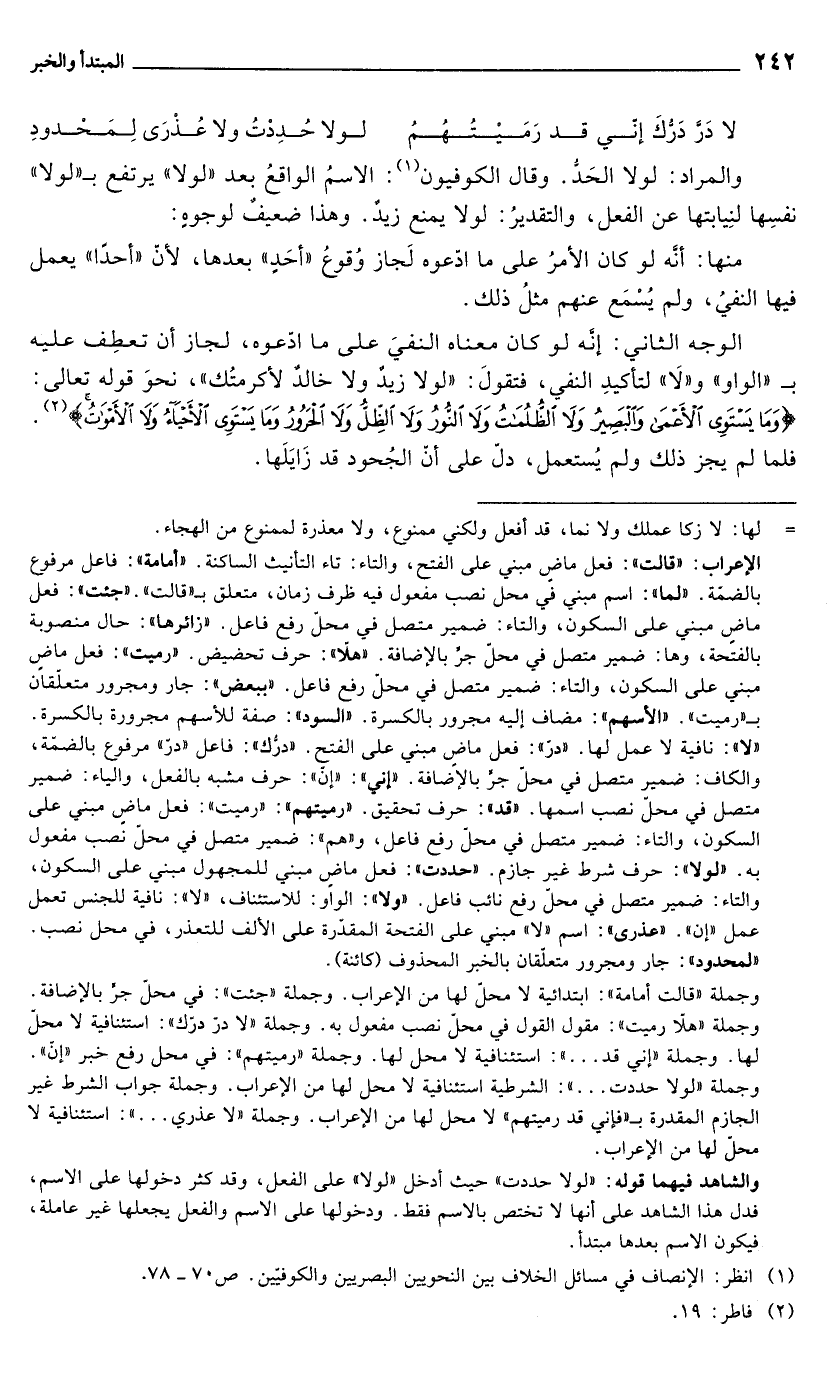 والشاهد فيهما قوله: "لولا حددت" حيث أدخل "لولا" على الفعل، وقد كثر دخولها على الاسم، فدل هذا الشاهد على أنها لا تختص بالاسم فقط. ودخولها على الاسم والفعل يجعلها غير عاملة، فيكون الاسم بعدها مبتدأ.