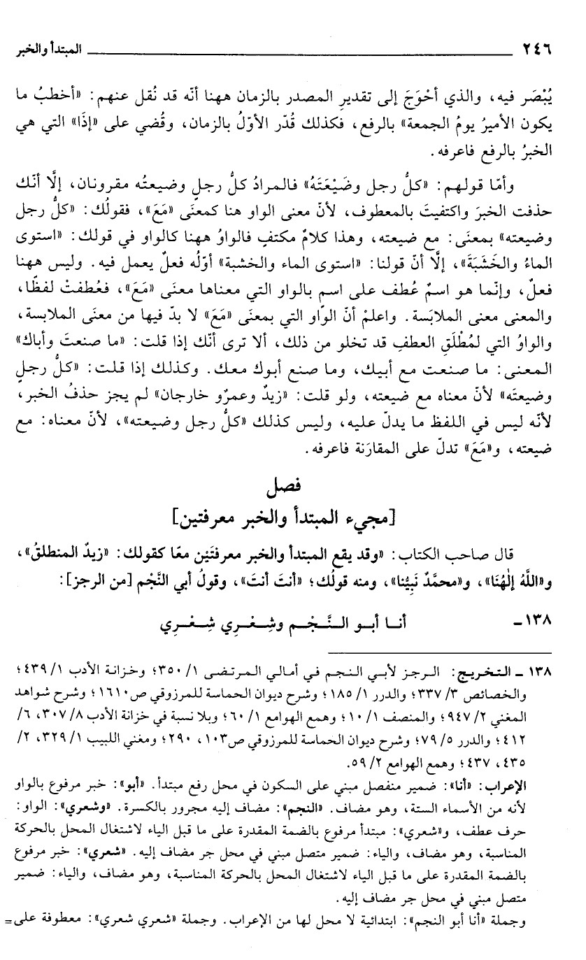 قال صاحب الكتاب: "وقد يقع المبتدأ والخبر معرفتَين معًا كقولك: "زيدٌ المنطلقُ"، و"الله إلهُنَا"، و"محمَّد نَبِينا"، ومنه قولُك؛ "أنتَ أنتَ"، وقولُ أبي النَّجْم [من الرجز]: