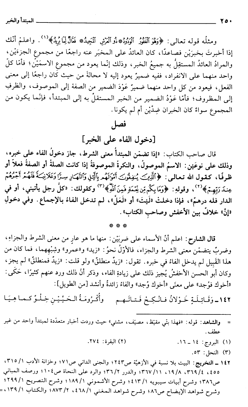 قال صاحب الكتاب: "إذا تضمّن المبتدأُ معنى الشرط، جاز دخولُ الفاء على خبره، وذلك على نوعَيْن: الاسمُ الموصولُ، والنكرةُ الموصوفةُ إذا كانت الصلةُ أو الصفةُ فعلاً أو ظرفًا، كقول الله تعالى: {الَّذِينَ يُنْفِقُونَ أَمْوَالَهُمْ بِاللَّيْلِ وَالنَّهَارِ سِرًّا وَعَلَانِيَةً فَلَهُمْ أَجْرُهُمْ عِنْدَ رَبِّهِمْ} (¬2)، وقولهِ: {وَمَا بِكُمْ مِنْ نِعْمَةٍ فَمِنَ اللَّهِ} (¬3) وكقولك: "كلُّ رجل يأتيني، أو في الدار فله درهمٌ"، فإذا دخلتْ "لَيْتَ" أو "لَعَلَّ"، لم تدخل الفاءُ بالإجماع. وفي دخولِ "إنَّ" خلافٌ بين الأخفش وصاحبِ الكتاب".