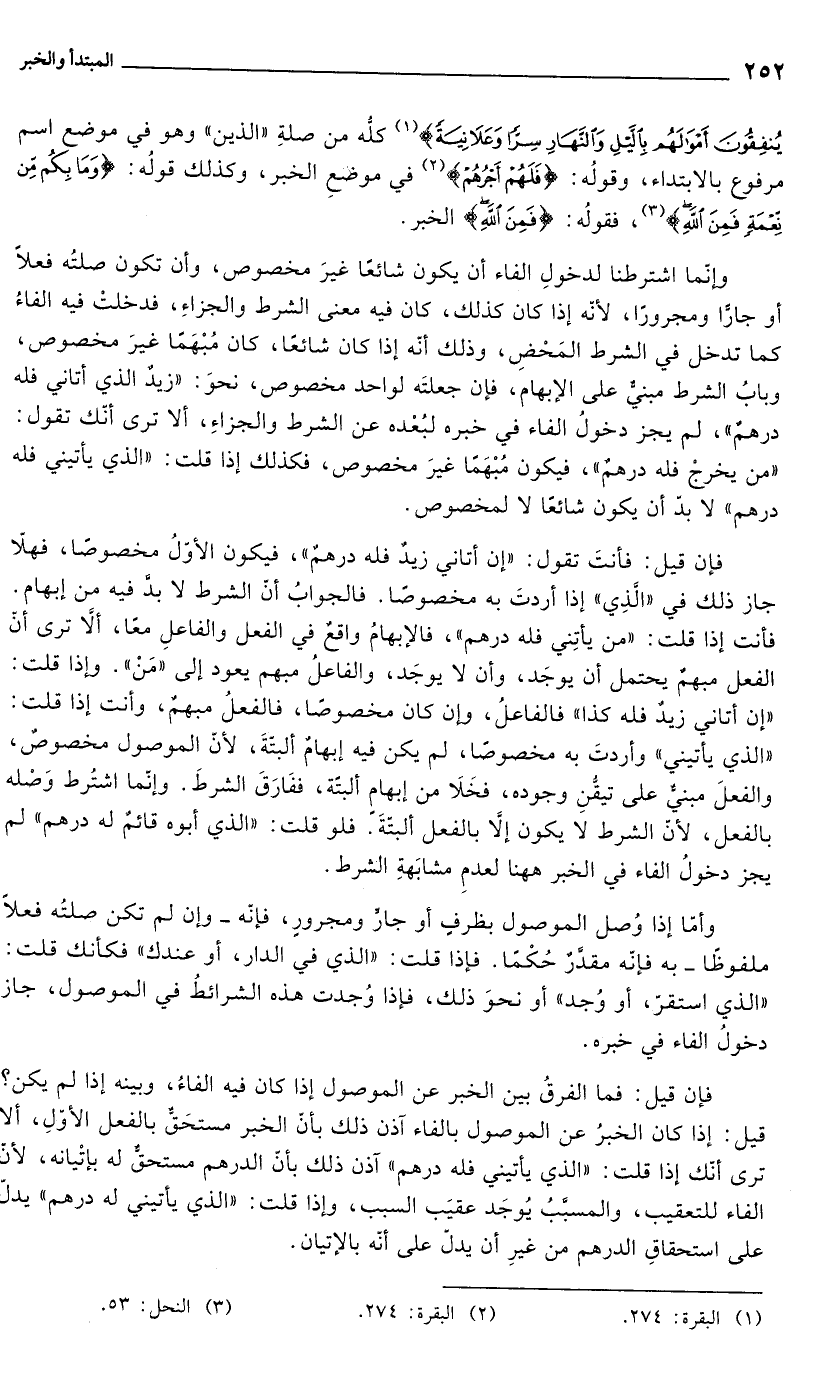 يُنْفِقُونَ أَمْوَالَهُمْ بِاللَّيْلِ وَالنَّهَارِ سِرًّا وَعَلَانِيَةً} (¬1) كلُّه من صلةِ "الذين" وهو في موضع اسم مرفوع بالابتداء، وقولُه: {فَلَهُمْ أَجْرُهُمْ} (¬2) في موضعِ الخبر، وكذلك قولُه: {وَمَا بِكُمْ مِنْ نِعْمَةٍ فَمِنَ اللَّهِ} (¬3)، فقولُه: {فَمِنَ اللَّهِ} الخبر.