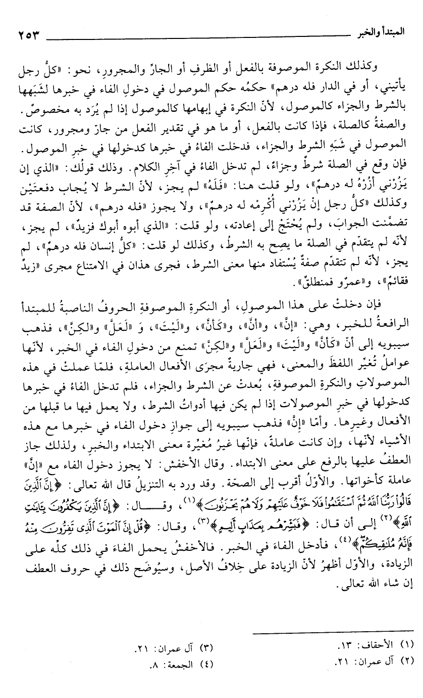فإن دخلتْ على هذا الموصولِ، أو النكرةِ الموصوفةِ الحروفُ الناصبةُ للمبتدأ الرافعةُ للخبر، وهي: "إنَّ"، و"أنَّ"، و"كَأنَّ"، و"لَيْتَ"، وَ "لَعَلَّ" و"لكِنَّ"، فذ هب سيبويه إلى أنّ "كَأنَّ" و"لَيْتَ" و"لَعَل" و"لكِنَّ" تمنع من دخولِ الفاء في الخبر, لأنها عواملُ تُغيِّر اللفظَ والمعنى، فهي جاريةٌ مجرَى الأفعال العاملةِ، فلمّا عملتْ في هذه الموصولاتِ والنكرةِ الموصوفةِ، بُعدتْ عن الشرط والجزاء، فلم تدخل الفاءُ في خبرها كدخولها في خبرِ الموصولات إذا لم يكن فيها أدواتُ الشرط، ولا يعمل فيها ما قبلها من الأفعال وغيرِها. وأمّا "إِنَّ" فذهب سيبويه إلى جوازِ دخول الفاء في خبرها مع هذه الأشياء لأنها، وإن كانت عاملةً، فإنها غيرُ مُغيِّرة معنى الابتداء والخبرِ، ولذلك جاز العطفُ عليها بالرفع على معنى الابتداء. وقال الأخفش: لا يجوز دخول الفاء مع "إنَّ" عاملة كأخواتها. والأوّلُ أقرب إلى الصحّة. وقد ورد به التنزيلُ قال الله تعالى: {إِنَّ الَّذِينَ قَالُوا رَبُّنَا اللَّهُ ثُمَّ اسْتَقَامُوا فَلَا خَوْفٌ عَلَيْهِمْ وَلَا هُمْ يَحْزَنُونَ} (¬1)، وقال: {إِنَّ الَّذِينَ يَكْفُرُونَ بِآيَاتِ اللَّهِ} (¬2) إلى أن قال: {فَبَشِّرْهُمْ بِعَذَابٍ أَلِيمٍ} (¬3)، وقال: {قُلْ إِنَّ الْمَوْتَ الَّذِي تَفِرُّونَ مِنْهُ فَإِنَّهُ مُلَاقِيكُمْ} (¬4)، فأدخل الفاءَ في الخبر. فالأخفشُ يحمل الفاءَ في ذلك كلِّه على الزيادة، والأوّل أظهرُ لأن الزيادة على خِلافُ الأصل، وسيُوضَح ذلك في حروف العطف إن شاء الله تعالى.