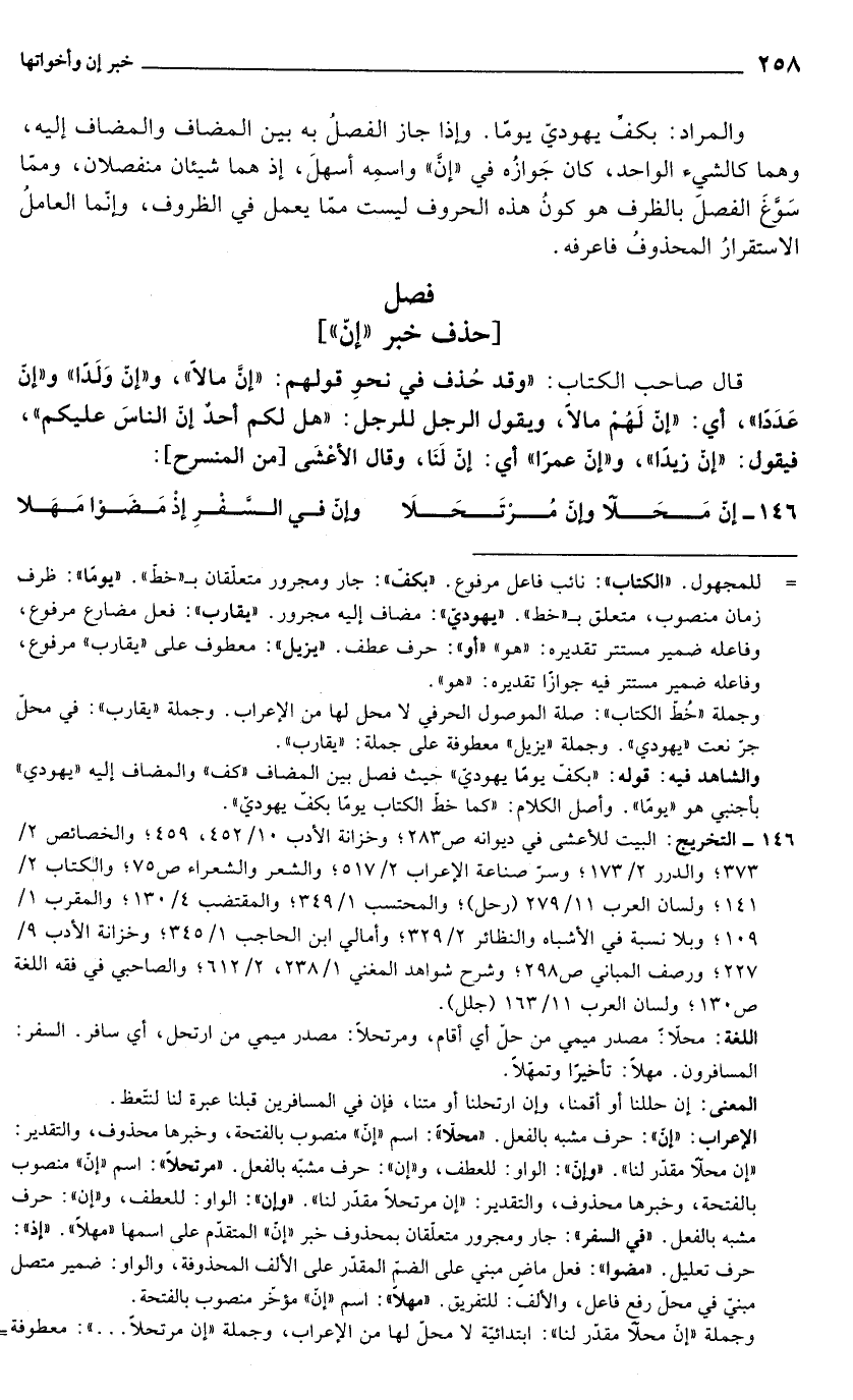 والمراد: بكفّ يهوديّ يومًا. وإذا جاز الفصلُ به بين المضاف والمضاف إليه، وهما كالشىء الواحد، كان جَوازُه في "إنَّ" واسمِه أسهلَ، إذ هما شيئان منفصلان، وممّا سَوَّغَ الفصلَ بالظرف هو كونُ هذه الحروف ليست ممّا يعمل في الظروف، وإنّما العاملُ الاستقرارُ المحذوفُ فاعرفه.