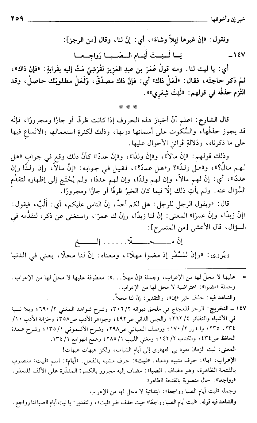والشاهد فيه قوله: "ليت أيام الصبا رواجعًا" حيث حذف خبر "ليت"، والتقدير: يا ليت أيام الصبا لنا رواجع.