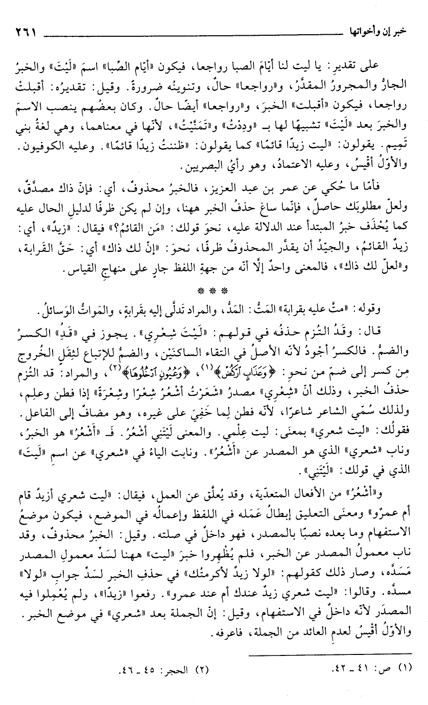 على تقديرِ: يا ليت لنا أيّامَ الصبا رواجعا، فيكون "أيام الصِّبا" اسمَ "لَيْتَ" والخبرُ الجارُّ والمجرورُ المقدَّرُ، و"رواجعا" حالٌ، وتنوينُه ضرورةً. وقيل: تقديرُه: أقبلتْ رواجعا، فيكون "أقبلت" الخبرَ، و"رواجعا" أيضًا حالٌ. وكان بعضُهم ينصب الاسمَ والخبرَ بعد "لَيْتَ" تشبيهًا لها بـ"ودِدْتُ" و"تَمَنَّيْتُ", لأنّها في معناهما، وهي لغةُ بني تَمِيم. يقولون: "ليت زيدًا قائمًا" كما يقولون: "ظننتُ زيدًا قائمًا". وعليه الكوفيون. والأوّلُ أقْيسُ، وعليه الاعتمادُ، وهو رأيُ البصريين.