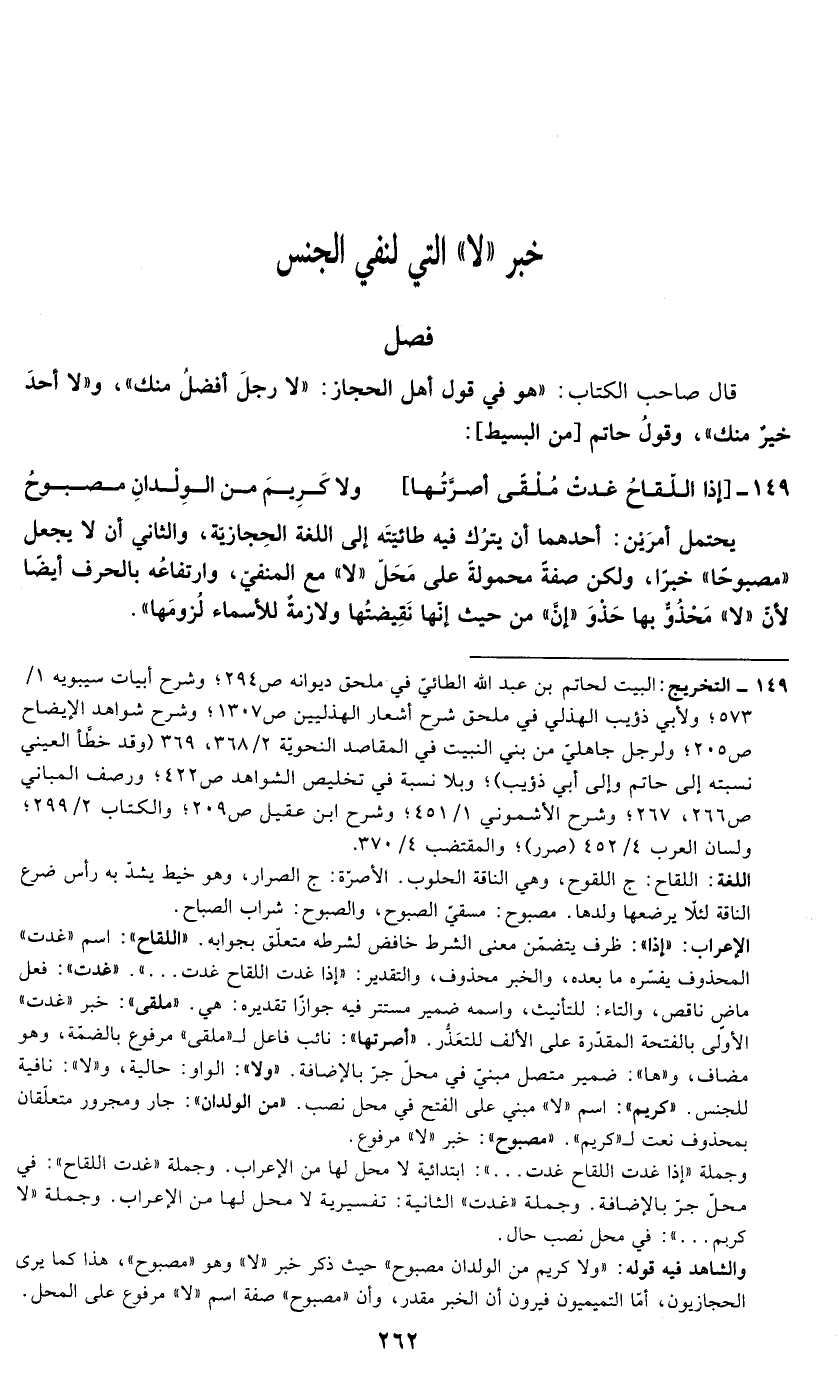 والشاهد فيه قوله: "ولا كريم من الولدان مصبوح" حيث ذكر خبر "لا" وهو"مصبوح"، هذا كما يرى الحجازيون، أمّا التميميون فيرون أن الخبر مقدر، وأن "مصبوح" صفة اسم "لا" مرفوع على المحل.