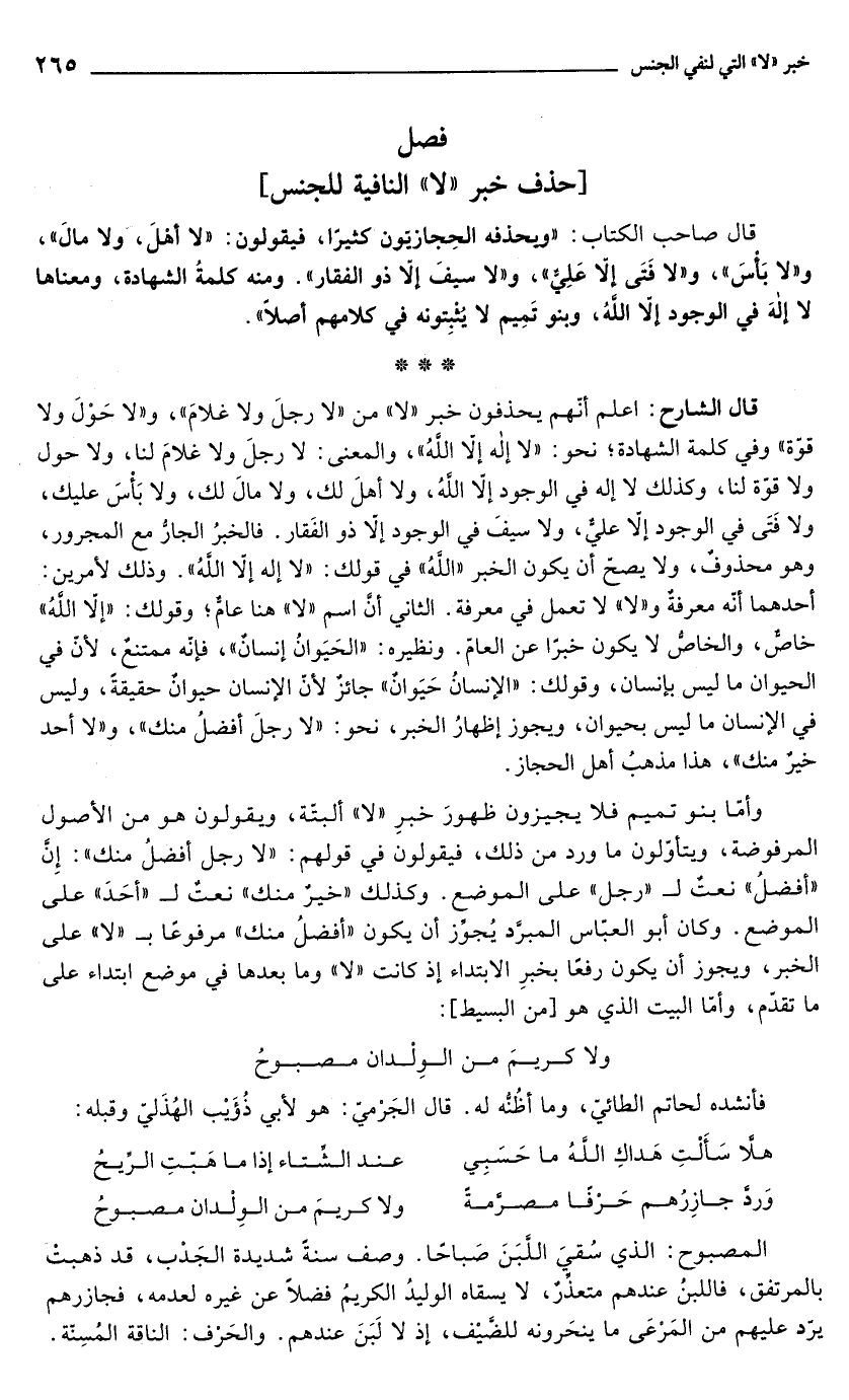 قال الشارح: اعلم أنّهم يحذفون خبر "لا" من "لا رجلَ ولا غلامَ"، و"لا حَوْلَ ولا قوّة" وفي كلمة الشهادة؛ نحو: "لا إله إلا اللهُ"، والمعنى: لا رجلَ ولا غلامَ لنا، ولا حول ولا قوّة لنا، وكذلك لا إله في الوجود إلّا الله، ولا أهلَ لك، ولا مالَ لك، ولا بَأْسَ عليك، ولا فَتَى في الوجود إلا علىٌّ، ولا سيفَ في الوجود إلَّا ذو الفَقار. فالخبرُ الجارُّ مع المجرور، وهو محذوفٌ، ولا يصحّ أن يكون الخبر "اللهُ" في قولك: "لا إله إلا الله". وذلك لأمرين: أحدهما أنَّه معرفةٌ و"لا" لا تعمل في معرفة. الثاني أنّ اسم "لا" هنا عامٌ؛ وقولك: "إلا الله" خاصُّ، والخاصُّ لا يكون خبرًا عن العامّ. ونظيره: "الحَيَوانُ إنسانٌ"، فإنّه ممتنعٌ, لأن في الحيوان ما ليس بإنسان، وقولك: "الإنسانُ حَيَوانٌ" جائزٌ لأنّ الإنسان حيوانٌ حقيقةً، وليس في الإنسان ما ليس بحيوان، ويجوز إظهارُ الخبر، نحو: "لا رجلَ أفضلُ منك"، و"لا أحد خيرٌ منك"، هذا مذهبُ أهل الحجاز.
