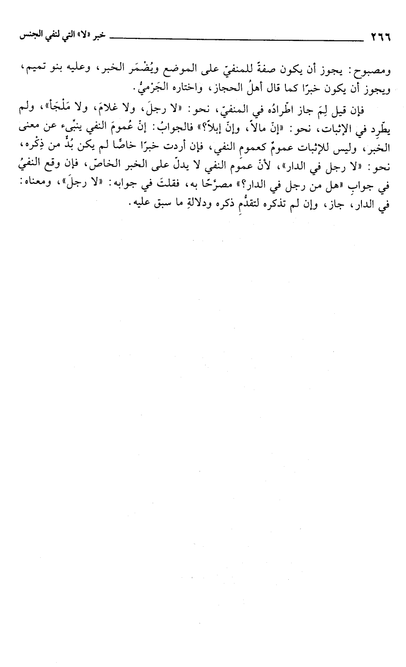 فإن قيل لِمَ جاز اطرادُه في المنفيّ، نحو: "لا رجلَ، ولا غلامَ، ولا مَلْجَأ"، ولم يطرِد في الإثبات، نحو: "إنّ مالاً، وإنّ إبلًا؟ " فالجوابُ: إنّ عُمومَ النفي ينِّبىء عن معنى الخبر، وليس للإثبات عمومٌ كعمومِ النفي، فإن أردت خبرًا خاصًّا لم يكن بُدٌّ من ذِكْره، نحو: "لا رجل في الدار", لأن عموم النفي لا يدلّ على الخبر الخاصّ، فإن وقع النفيُ في جواب "هل من رجل في الدار؟ " مصرَّحًا به، فقلتَ في جوابه: "لا رجلَ"، ومعناه: في الدار، جاز، وإن لم تذكره لتقدُّمِ ذكره ودلالةِ ما سبق عليه.