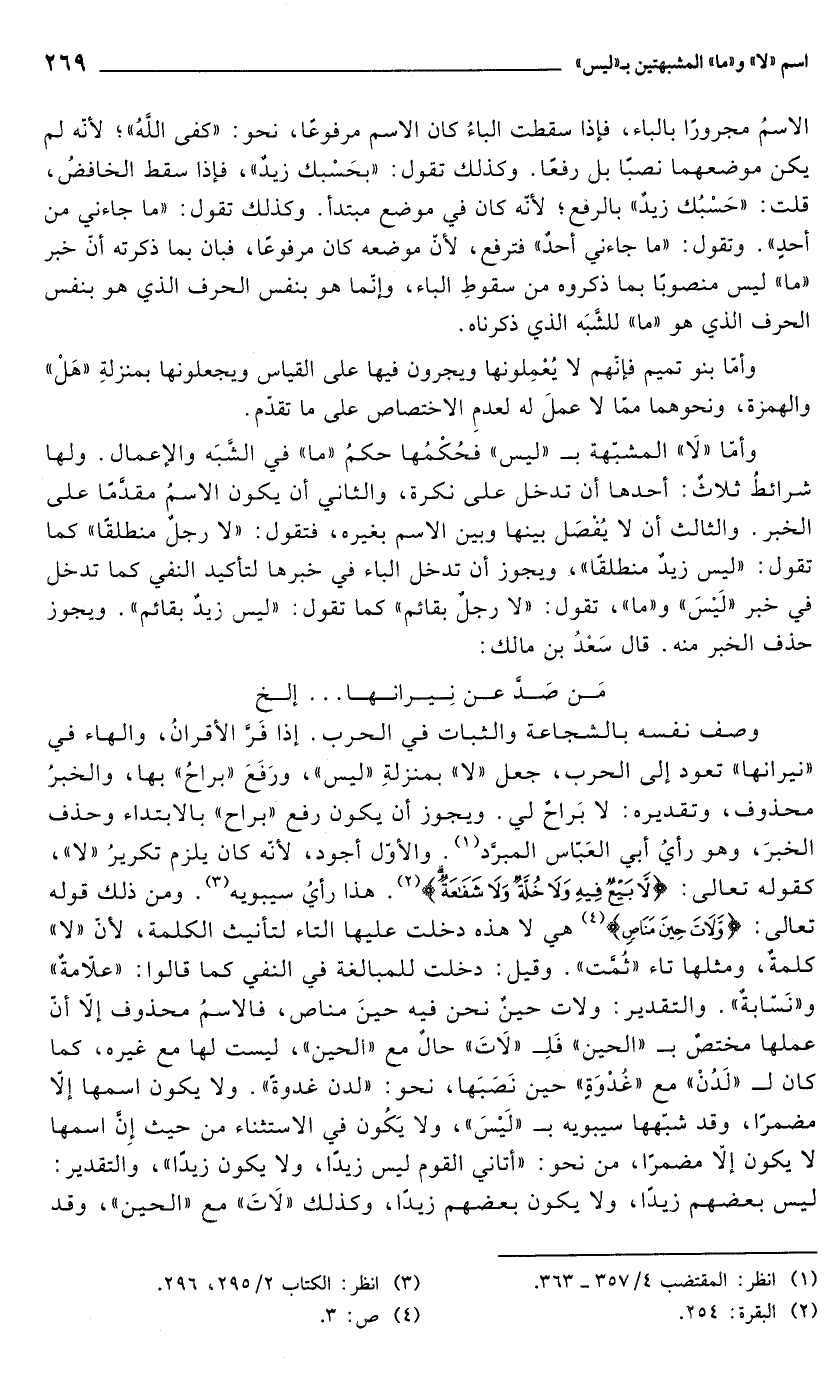 وصف نفسه بالشجاعة والثبات في الحرب. إذا فَرَّ الأقرانُ، والهاء في "نيرانها" تعود إلى الحرب، جعل "لا" بمنزلةِ "ليس"، ورَفَعَ "براح" بها، والخبرُ محذوف، وتقديره: لا بَراحٌ لي. ويجوز أن يكون رفع "براح" بالابتداء وحذف الخبرَ، وهو رأيُ أبي العَبَّاس المبرَّد (¬1) والأوّل أجود, لأنّه كان يلزم تكريرُ "لا"، كقوله تعالى: {لَا بَيْعٌ فِيهِ وَلَا خُلَّةٌ وَلَا شَفَاعَةٌ} (¬2). هذا رأيُ سيبويه (¬3). ومن ذلك قوله تعالى: {وَلَاتَ حِينَ مَنَاصٍ} (¬4) هي لا هذه دخلت عليها التاء لتأنيث الكلمة, لأنّ "لا" كلمةٌ، ومثلها تاء "ثُمَّت". وقيل: دخلت للمبالغة في النفي كما قالوا: "علّامةٌ" و"نَسَّابةٌ". والتقدير: ولات حينٌ نحن فيه حينَ مناص، فالاسمُ محذوف إلَّا أنَّ عملها مختصٌ بـ"الحين" فَلِـ"لَاتَ" حالٌ مع "الحين"، ليست لها مع غيره، كما كان لـ"لَدُنْ" مع "غدْوَةٍ" حين نَصَبَها، نحو: "لدن غدوةً". ولا يكون اسمها إلَّا مضمرًا، وقد شبّهها سيبويه بـ"لَيْسَ"، ولا يَكُون في الاستثناء من حيث إِنَّ اسمها لا يكون إلَّا مضمرًا، من نحو: "أتاني القوم ليس زيدًا، ولا يكون زيدًا"، والتقدير: ليس بعضهم زيدًا، ولا يكون بعضهم زيدًا، وكذلك "لَاتَ" مع "الحين"، وقد