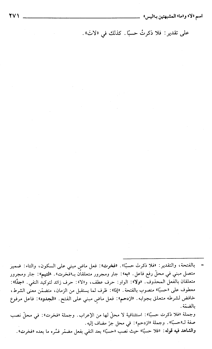 = بالفتحة، والتقدير: "فلا ذكرتَ حسبًا". "فخرت": فعل ماضٍ مبني على السكون، والتاء: ضمير متصل مبني في محلّ رفع فاعل. "به": جار ومجرور متعلقان بـ "فخرت". "لتيم": جار ومجرور متعلقان بالفعل المحذوف. "ولا": الواو: حرف عطف، و"لا": حرف زائد لتوكيد النفي. "جدًّا": معطوف على "حسبًا" منصوب بالفتحة. "إذا": ظرف لما يستقبل من الزمان، متضمّن معنى الشرط، خافض لشرطه متعلق بجوابه. "ازدحم": فعل ماضٍ مبني على الفتح. "الجدود": فاعل مرفوع بالضمّة.
