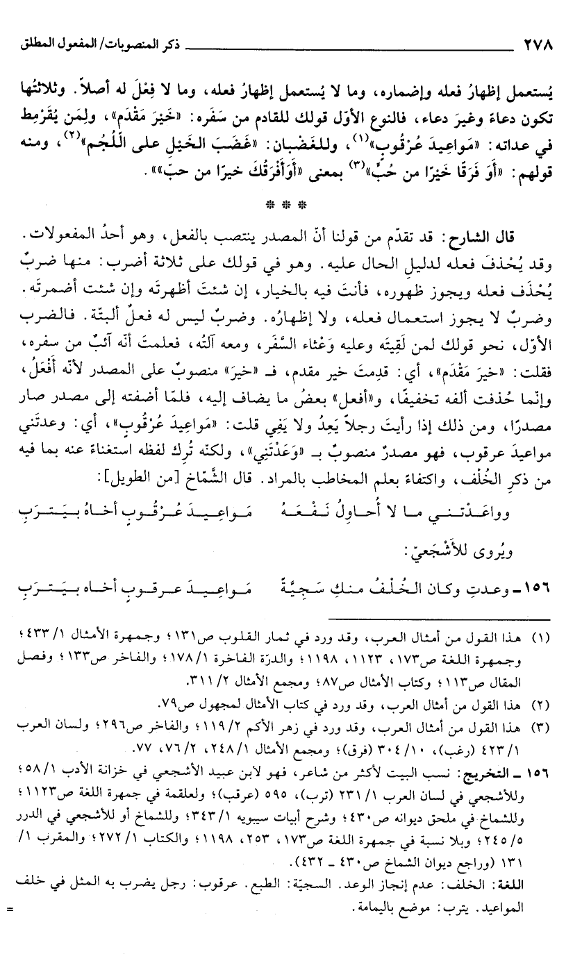 قال الشارح: قد تقدّم من قولنا أنّ المصدر ينتصب بالفعل، وهو أحدُ المفعولات. وقد يُحْذفَ فعله لدليلِ الحال عليه. وهو في قولك على ثلاثة أضرب: منها ضربٌ يُحْذَف فعله ويجوز ظهوره، فأنتَ فيه بالخيار، إن شئتَ أظهرتَه وإن شئت أضمرتَه. وضربٌ لا يجوز استعمال فعله، ولا إظهارُه. وضربٌ ليس له فعلٌ ألبتّة. فالضرب الأوّل، نحو قولك لمن لَقِيتَه وعليه وَعْثاء السَّفَر، ومعه آلتُه، فعلمتَ أنّه آئبٌ من سفره، فقلت: "خيرَ مَقْدَم"، أي: قدِمتَ خير مقدم، فـ "خيرَ" منصوبٌ على المصدر لأنّه أَفْعَلُ، وإنَّما حُذفت ألفه تخفيفًا، و"أفعل" بعضُ ما يضاف إليه، فلمّا أضفته إلى مصدر صار مصدرًا، ومن ذلك إذا رأيتَ رجلًا يَعِدُ ولا يَفِي قلت: "مَواعِيدَ عُرْقُوب"، أي: وعدتَني مواعيدَ عرقوب، فهو مصدرٌ منصوبٌ بـ"وَعَدْتَنِي"، ولكنه تُرِك لفظه استغناء عنه بما فيه من ذكرِ الخُلْف، واكتفاء بعلم المخاطب بالمراد. قال الشَّمّاخ [من الطويل]: