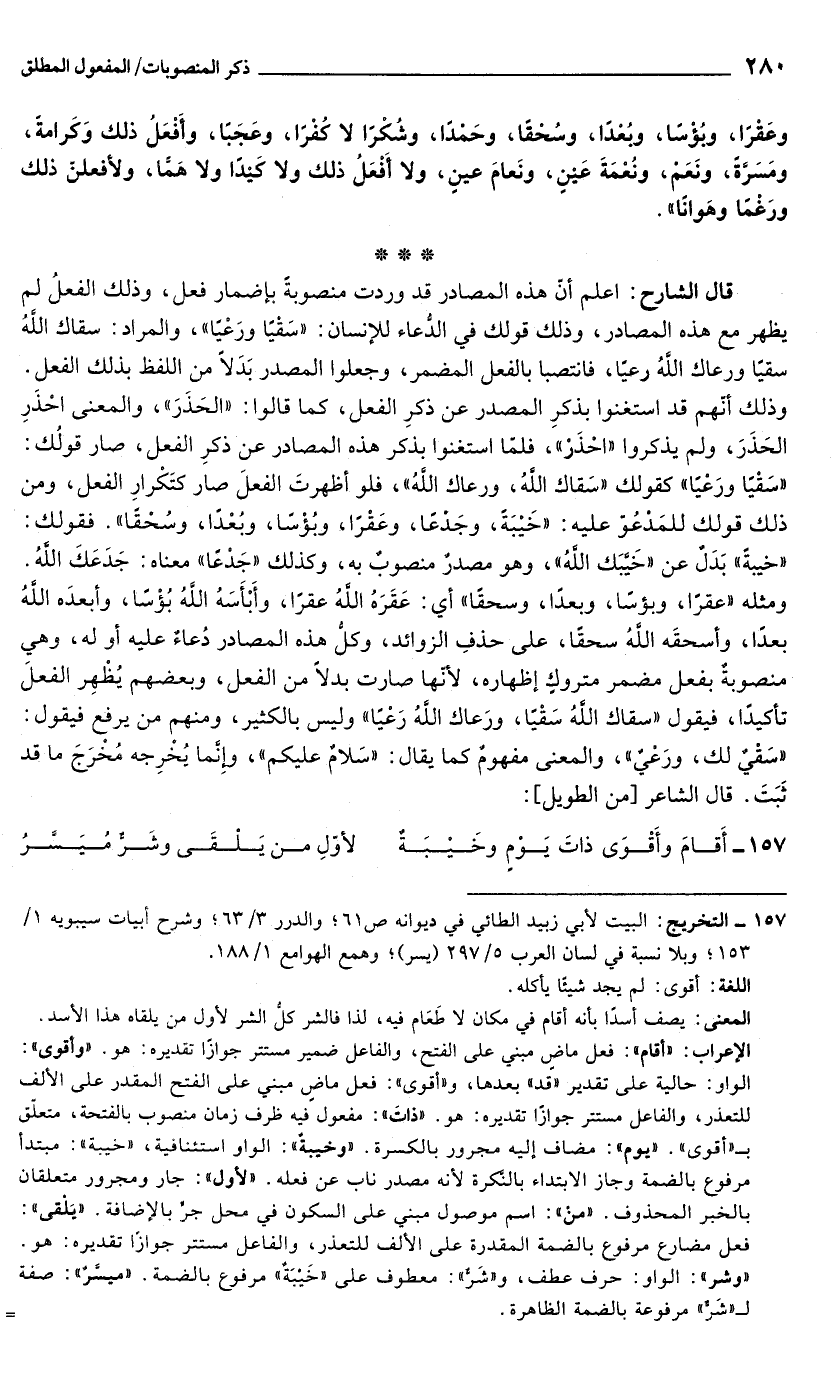 قال الشارح: اعلم أنّ هذه المصادر قد وردت منصوبة بإضمار فعل، وذلك الفعلُ لم يظهر مع هذه المصادر، وذلك قولك في الدُّعاء للإنسان: "سَقيًا ورَعْيًا"، والمراد: سقاك الله سقيًا ورعاك اللهُ رعيًا، فانتصبا بالفعل المضمر، وجعلوا المصدر بَدَلًا من اللفظ بذلك الفعل. وذلك أنّهم قد استغنوا بذكرِ المصدر عن ذكرِ الفعل، كما قالوا: "الحَذَرَ"، والمعنى احْذَرِ الحَذَرَ، ولم يذكروا "احْذَرْ"، فلمّا استغنوا بذكر هذه المصادر عن ذكرِ الفعل، صار قولُك: "سَقْيًا ورَعْيًا" كقولك "سَقاك الله، ورعاك اللهُ"، فلو أظهرتَ الفعلَ صار كتَكْرارِ الفعل، ومن ذلك قولك للمَدْعُوّ عليه: "خَيْبَة، وجَدْعًا، وعَقْرًا، وبُؤْسًا، وبُعْدًا، وسُحْقًا". فقولك: "خيبة" بَدَلٌ عن "خَيَّبَك اللهُ"، وهو مصدرٌ منصوبٌ به، وكذلك "جَدْعًا" معناه: جَدَعَكَ اللهُ. ومثله "عقرًا، وبؤسًا، وبعدًا، وسحقًا" أي: عَقَرَهُ الله عقرًا، وأَبْأَسَهُ اللهُ بُؤْسًا، وأبعدَه اللهُ بعدًا، وأسحقَه اللهُ سحقًا، على حذفِ الزوائد، وكلُّ هذه المصادر دُعاءٌ عليه أو له، وهي منصوبةٌ بفعل مضمر متروكٍ إظهاره، لأنّها صارت بدلًا من الفعل، وبعضهم يُظهِر الفعلَ تأكيدًا، فيقول "سقاك الله سَقْيًا، ورَعاك الله رَعْيًا" وليس بالكثير، ومنهم من يرفع فيقول: "سَقْىٌ لك، ورَعْيً"، والمعنى مفهومٌ كما يقال: "سلامٌ عليكم"، وإِنما يُخْرِجه مُخرَجَ ما قد ثَبَتَ. قال الشاعر [من الطويل]: