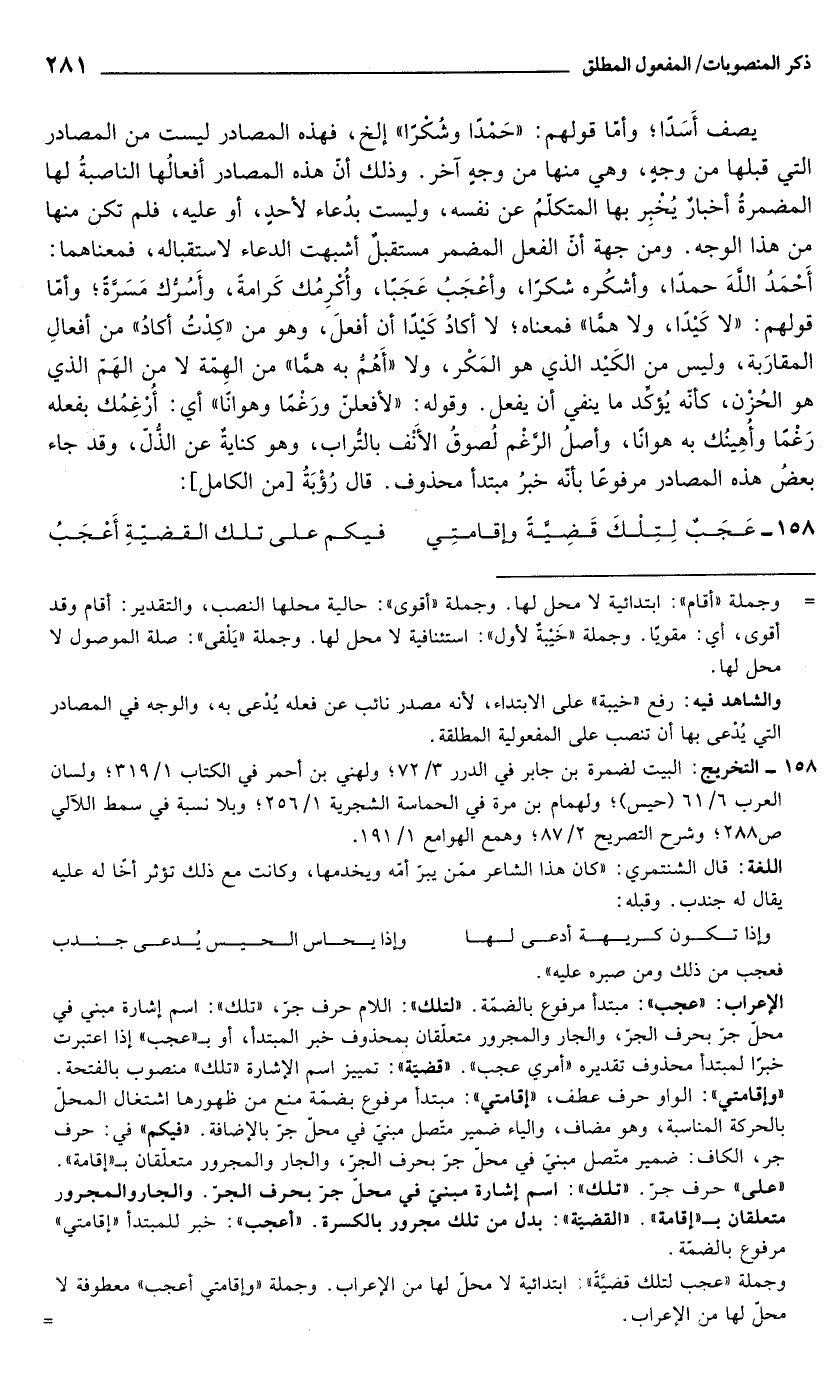 يصف أَسَدًا؛ وأمّا قولهم: "حَمْدًا وشُكرًا" إلخ، فهذه المصادر ليست من المصادر اقي قبلها من وجهٍ، وهي منها من وجهٍ آخر. وذلك أنّ هذه المصادر أفعالُها الناصبةُ لها المضمرةُ أخبارٌ يُخْبِر بها المتكلّمُ عن نفسه، وليست بدُعاء لأحدٍ، أو عليه، فلم تكن منها من هذا الوجه. ومن جهة أنّ الفعل المضمر مستقبلٌ أشبهت الدعاء لاستقباله، فمعناهما: أَحْمَدُ الله حمدًا، وأشكُره شكرًا، وأعْجَبُ عَجَبًا، وأُكْرِمُك كَرامةً، وأَسُرُّك مَسَرَّةً؛ وأمّا قولهم: "لا كَيْدًا، ولا همًا" فمعناه؛ لا أكادُ كَيْدًا أن أفعلَ، وهو من "كِدْتُ أكادُ" من أفعالِ المقارَبة، وليس من الكَيْد الذي هو المَكْر، ولا "أَهْمُّ به همًّا" من الهِمّة لا من الهَمّ الذي هو الحُزْن، كأنّه يُؤكد ما ينقي أن يفعل. وقوله: "لأفعلنّ ورَغْمًا وهوانًا" أي: أُرْغِمُك بفعله رَغْمًا وأُهِينُك به هوانًا، وأصلُ الرَّغْم لُصوقُ الأَنْف بالتُّراب، وهو كنايةٌ عن الذُلّ، وقد جاء بعضُ هذه المصادر مرفوعًا بأنّه خبرُ مبتدأ محذوف. قال رُؤْبَةُ [من الكامل]: