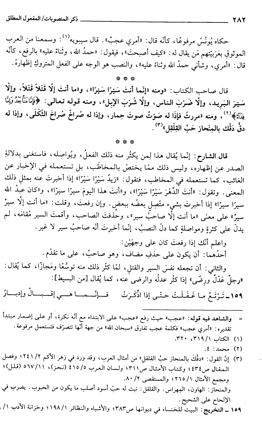 قال الشارح: إنّما يُقال هذا لِمن يكثُر منه ذلك الفعلُ، ويُواصِله، فاستغنى بدلالةِ الصدر عن إظهاره، وليس ذلك ممَّا يختصّ بالمخاطَب، بل تستعمله في الإخبار عن الغائب، كما تستعمله في المخاطب، فتقول: "زيدٌ سَيْرًا سَيْرًا" إذا أخبرتَ عنه بمثلِ ذلك المعنى. وتقول: "أنتَ الدَّهْرَ سَيْرًا سَيْرًا"، و"أنتَ هذا اليومَ سيرًا سيرًا"، و"كان عبدُ الله سيرًا سيرًا" إذا أخبرتَ بشيء متّصِلٍ بعضُه ببعضٍ. وإن رفعتَ، وقلت: "ما أنت إلا سيرٌ سيرٌ" على معنَى "ما أنت إلَّا صاحبُ سير"، وحذفتَ الصاحب، وأقمتَ السير مُقامَه، لم يدل على كثرةِ ومواصلةٍ كما دلّ النصبُ، إنّما أخبرتَ أنّه صاحبُ سير لا غير.