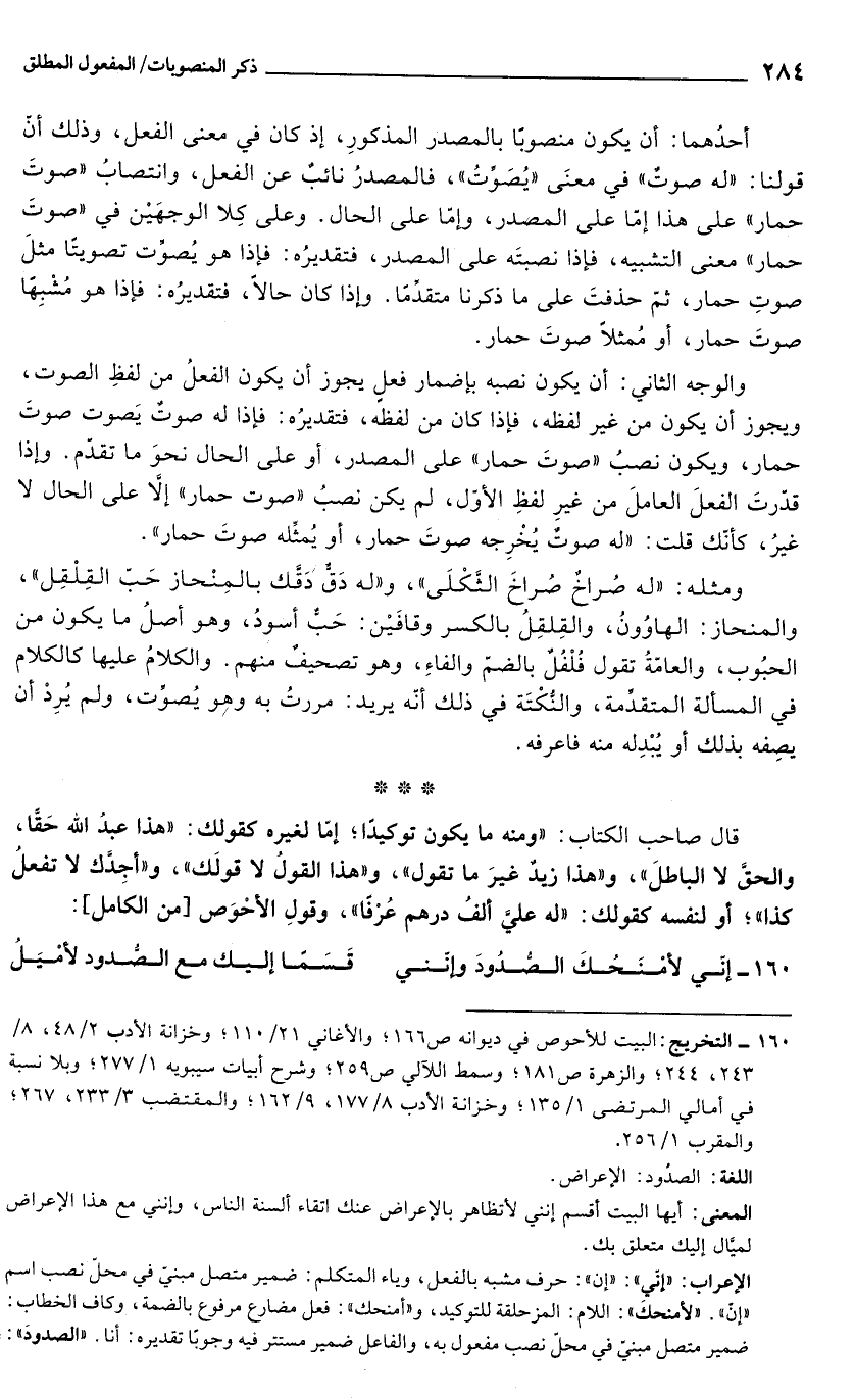 والوجه الثاني: أن يكون نصبه بإضمار فعل يجوز أن يكون الفعلُ من لفظِ الصوت، ويجوز أن يكون من غير لفظه، فإذا كان من لفظه، فتقديرُه: فإذا له صوتٌ يَصوت صوتَ حمار، ويكون نصبُ "صوتَ حمار" على المصدر، أو على الحال نحوَ ما تقدّم. وإذا قدّرتَ الفعلَ العاملَ من غيرِ لفظِ الأول، لم يكن نصبُ "صوت حمار" إلَّا على الحال لا غيرُ، كأنّك قلت: "له صوتٌ يُخْرِجه صوتَ حمار، أو يُمثِّله صوتَ حمار".