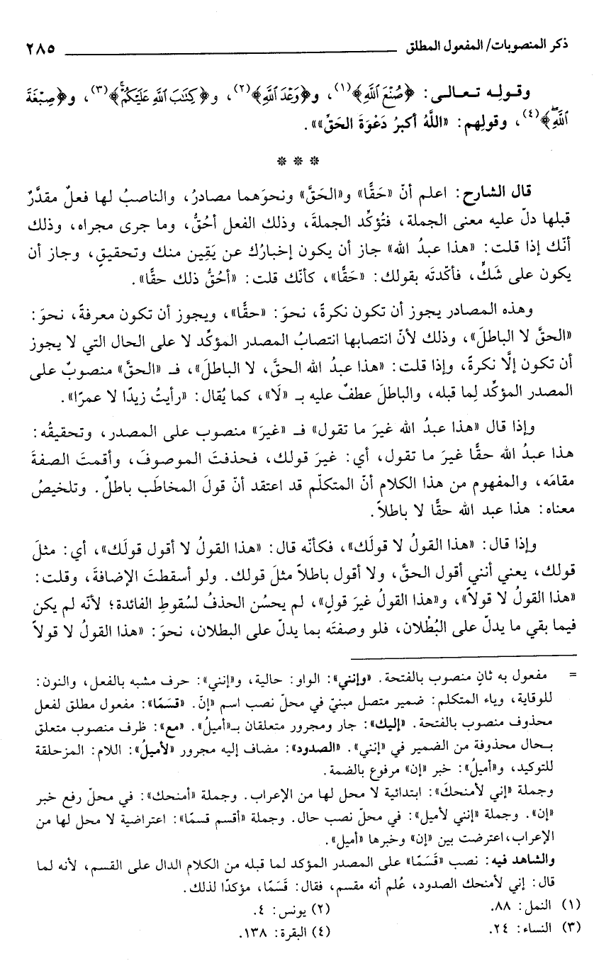 وهذه المصادر يجوز أن تكون نكرةً، نحوَ: "حقًّا"، ويجوز أن تكون معرفة، نحوَ: "الحق لا الباطلَ"، وذلك لأنّ انتصابها انتصابُ المصدر المؤكِّد لا على الحال التي لا يجوز أن تكون إلَّا نكرةٌ، وإذا قلت: "هذا عبدُ الله الحقُّ، لا الباطلَ"، فـ"الحقَّ" منصوبٌ على المصدر المؤكِّد لِما قبله، والباطلَ عطفٌ عليه بـ"لَا"، كما يُقال: "رأيتُ زيدًا لا عمرًا".