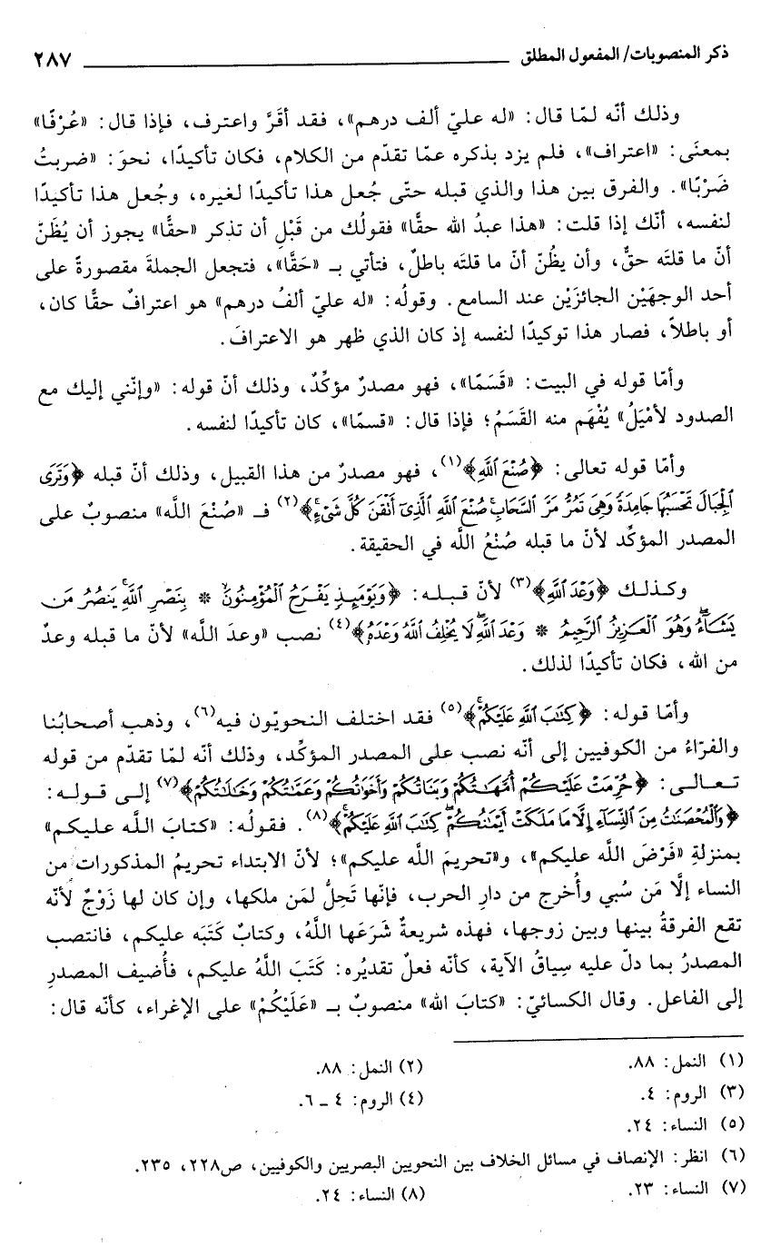 وأمّا قوله: {كِتَابَ اللَّهِ عَلَيْكُمْ} (¬5) فقد اختلف النحويون فيه (¬6)، وذهب أصحابُنا والفرّاءُ من الكوفيين إلى أنّه نصب على المصدر المؤكّد، وذلك أنّه لمّا تقدّم من قوله تعالى: {حُرِّمَتْ عَلَيْكُمْ أُمَّهَاتُكُمْ وَبَنَاتُكُمْ وَأَخَوَاتُكُمْ وَعَمَّاتُكُمْ وَخَالَاتُكُمْ} (¬7) إلى قوله: {وَالْمُحْصَنَاتُ مِنَ النِّسَاءِ إِلَّا مَا مَلَكَتْ أَيْمَانُكُمْ كِتَابَ اللَّهِ عَلَيْكُمْ} (¬8). فقولُه: "كتابَ الله عليكم" بمنزلةِ "فَرْضَ الله عليكم"، و"تحريمَ الله عليكم"؛ لأنّ الابتداء تحريمُ المذكورات من النساء إلَّا مَن سُبي وأُخرج من دارِ الحرب، فإنّها تَحِلُّ لمَن ملكها، وإن كان لها زَوْجٌ لأنّه تقع الفرقةُ بينها وبين زوجها، فهذه شريعةٌ شَرَعَها اللهُ، وكتابٌ كَتَبَه عليكم، فانتصب المصدرُ بما دلّ عليه سِياقُ الآية، كأنّه فعلٌ تقديُره: كَتَبَ اللهُ عليكم، فأُضيف المصدرِ إلى الفاعل. وقال الكسائيّ: "كتابَ الله" منصوبٌ بـ"عَلَيْكُمْ" على الإغراء، كأنّه قال: