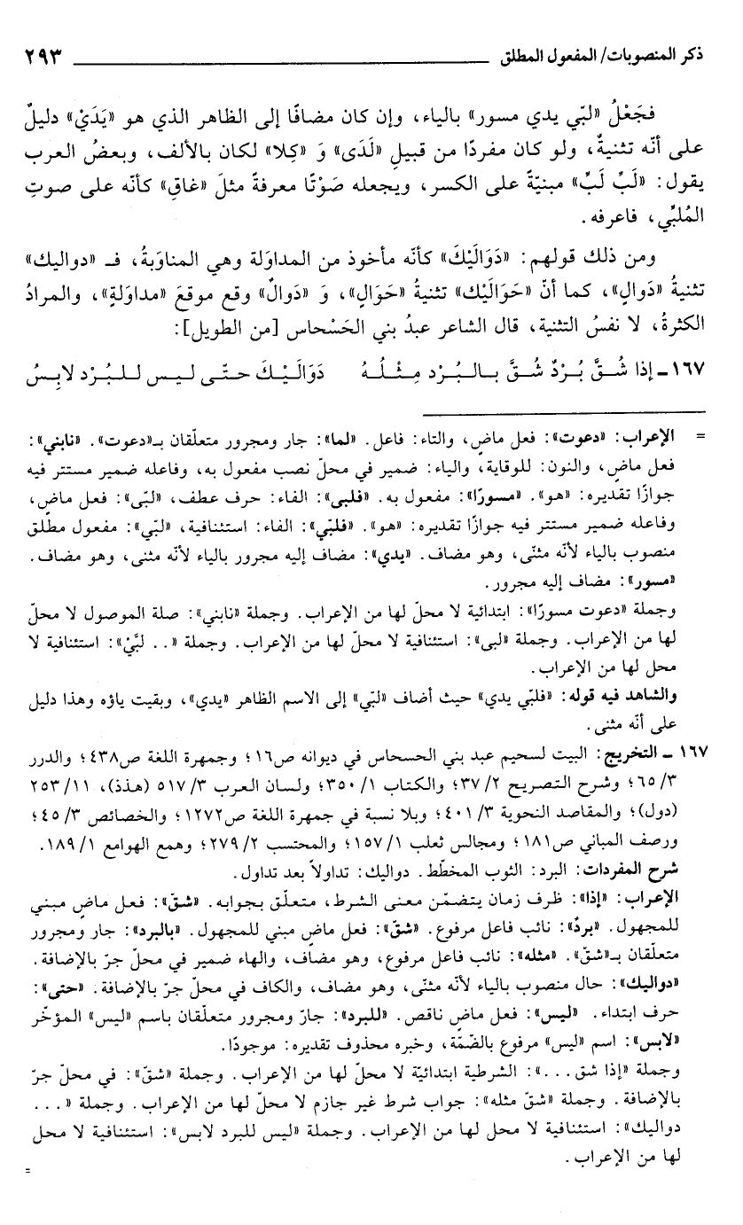 فجَعْلُ "لبّي يدي مسور" بالياء، وإن كان مضافًا إلى الظاهر الذي هو "يَدَيْ" دليلٌ على أنّه تثنيةٌ، ولو كان مفردًا من قبيلِ "لَدَى" وَ "كِلا" لكان بالألف، وبعضُ العرب يقول: "لَبِّ لَبِّ" مبنيّةً على الكسر، ويجعله صَوْتًا معرفة مثلَ "غاقِ" كأنّه على صوتِ المُلبِّي، فاعرفه.
