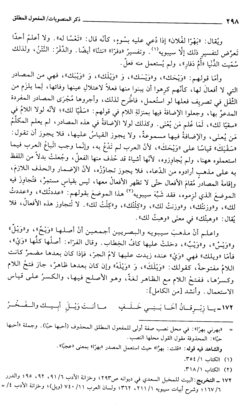 وأمّا قولهم: "وَيْحَك"، و"وَيْسَك"، وَ "وَيْلَك"، وَ "وَيْبَك"، فهي من المصادر التي لا أفعالَ لها، كأنّهم كرِهوا أن يبنوا منها فعلًا لاعتلالِ عينها وفائها، لِما يلزَم من الثِّقَل في تصريِف فعلها لو استُعمل، فاطُّرح لذلك، وأجروها مُجْرَى المصادر المفردة المدعوِّ بها، وجعلوا الإضافةَ فيها بمنزلةِ اللام في قولهم: "سَقْيًا لك"؛ لانّه لولا اللامُ في "سقيًا لك"، لَمَا عُلم مَن يُعْنَى. وكذلك لولا الإضافةُ في هذه المصادر، لم يعلم المكلَّمُ مَن يُعنَى، والإضافةُ فيها مسموعةٌ، ولا يجوز القياسُ عليها، فلا يجوز أن تقول: "سَقْيَكَ" قياسًا على "وَيْحَكَ", لأنّ العرب لم تَدْعُ به، وإنّما وجب اتّباعُ العرب فيما استعملوه ههنا، ولم يُجاوِزوه, لأنّها أشياءُ قد حُذف منها الفعلُ، وجُعلتْ بدلًا من اللفظ به على مذهب أرادوه من الدّعاء، فلا يجوز تجاوُزُه, لأن الإضمار والحذف اللازمَ، وإقامةَ المصادر مُقامَ الأفعال حتّى لا تظهر الأفعالُ معها، ليس بقياسٍ مستمِرِّ، فتُجاوِزَ فيه الموضعَ الذي لزِموه، فقد شَبَّهَ سيبويه (¬2) هذا الموضعَ بقولهم: "عددتُك"، و"عددتُ لك"، و"وزنتُك"، و"وزنتُ لك"، و"كِلْتُك"، و"كِلْتُ لك". لا تُتجاوز هذه الأفعالُ، فلا يُقال: "وهبتُك" في معنَى "وهبتُ لك".