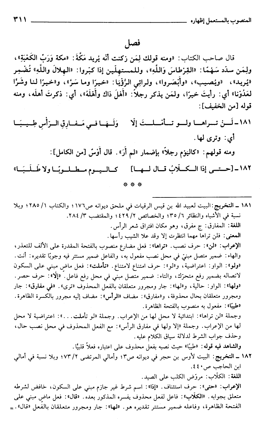 181 - التخريج: البيت لعبيد الله بن قيس الرقيات في ملحق ديوانه ص 176؛ والكتاب 1/ 285؛ وبلا نسبة في الأشباه والنظائر 6/ 35؛ والخصائص 2/ 429؛ والمقتضب 3/ 284.