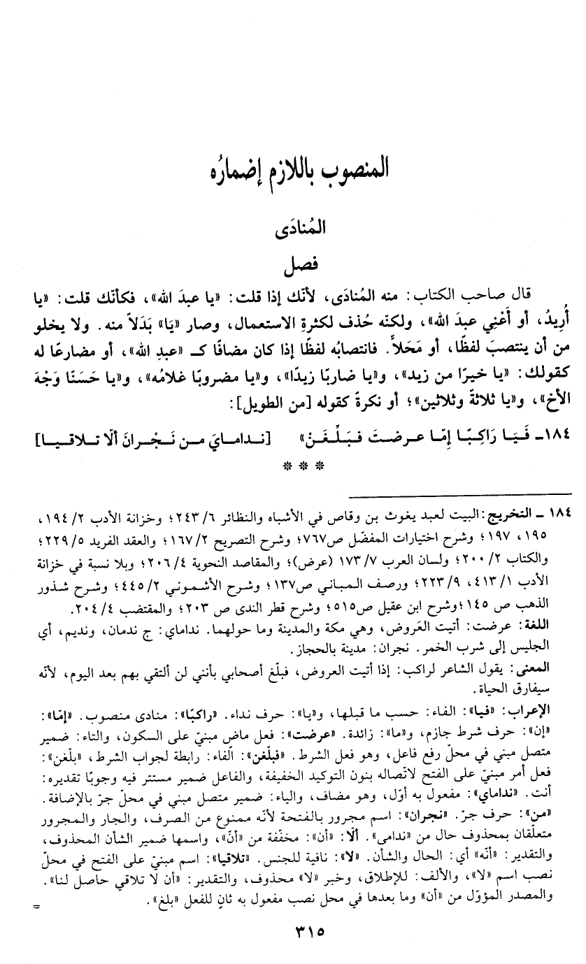قال صاحب الكتاب: منه المُنادَى, لأنّك إذا قلت: "يا عبدَ الله"، فكأنّك قلت: "يا أُرِيدُ، أو أَعْنِي عبدَ الله"، ولكنّه حُذف لكثرةِ الاستعمال، وصار "يَا" بَدَلًا منه. ولا يخلو من أن ينتصبَ لفظًا، أو مَحَلاً. فانتصابُه لفظًا إذا كان مضافًا كـ "عبدِ الله"، أو مضارعًا له كقولك: "يا خيرًا من زيد"، و"يا ضاربًا زيدًا"، و"يا مضروبًا غلامُه"، و"يا حَسَنًا وَجْهَ الأخ"، و"يا ثلاثة وثلاثين"؛ أو نكرة كقوله [من الطويل]: