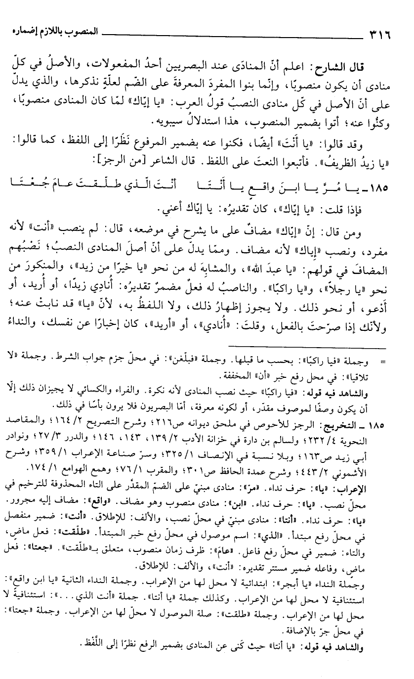 قال الشارح: اعلم أنّ المنادَى عند البصريين أحدُ المفعولات، والأصلُ في كلّ منادى أن يكون منصوبًا، وإنّما بنوا المفردَ المعرفةَ على الضّم لعلّةٍ نذكرها، والذي يدلّ على أنّ الأصل في كل منادى النصبُ قولُ العرب: "يا إيّاك" لما كان المنادى منصوبًا، وكنُّوا عنه؛ أتوا بضمير المنصوب، هذا استدلالُ سيبويه.