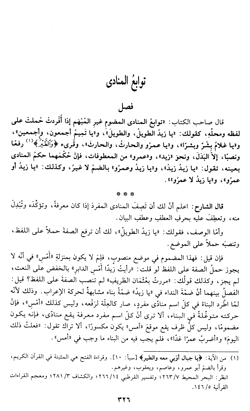قال الشارح: اعلم أنّ لك أنّ تَصِفَ المنادى المفردَ إذا كان معرفةً، وتؤكِّدَه وتُبْدِلَ منه، وتعطِفَ عليه بحرفِ العطفِ وعطفِ البيان.