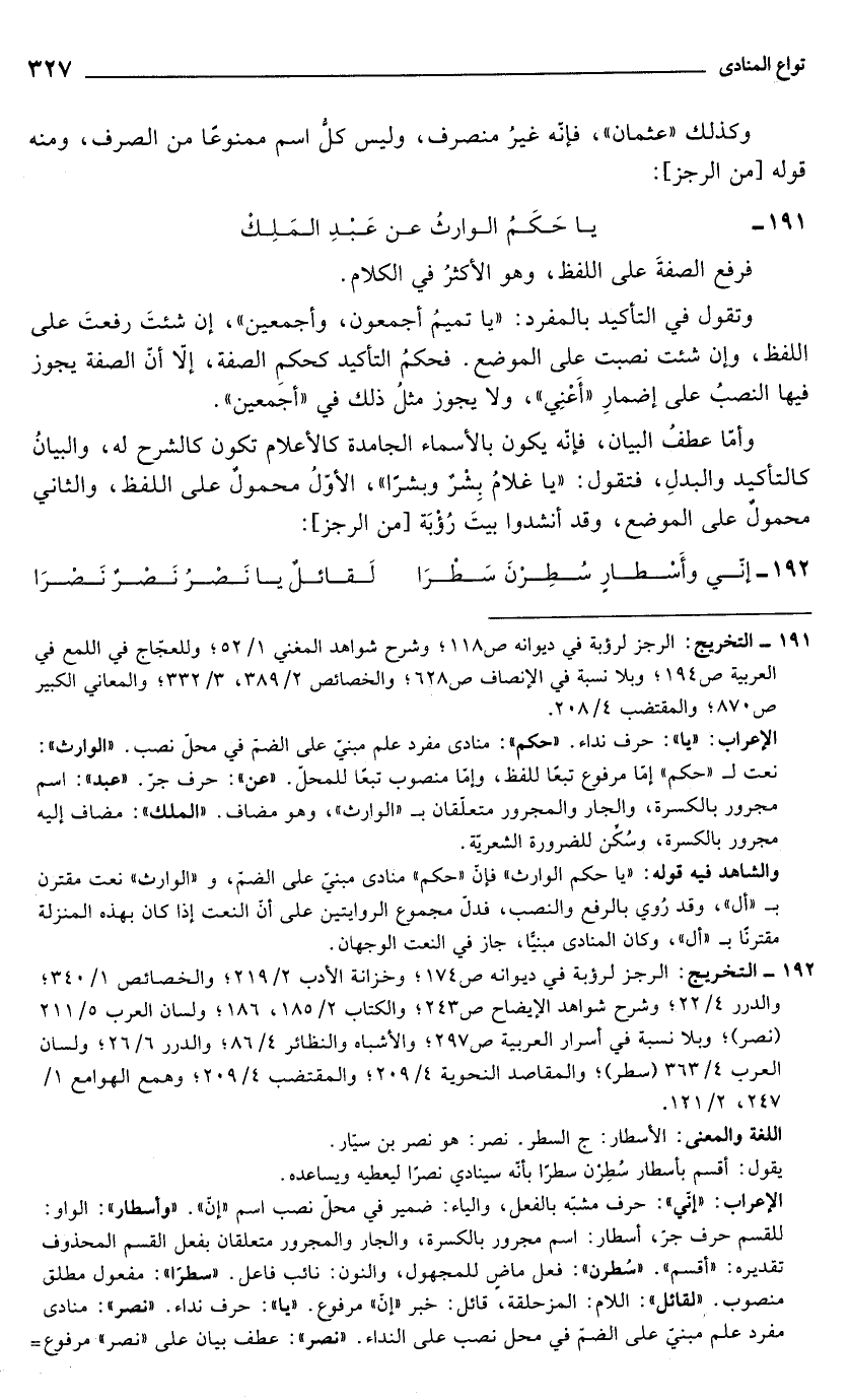 والشاهد فيه قوله: "يا حكم الوارث" فإنّ "حكم" منادى مبني على الضمّ، و"الوارث" نعت مقترن بـ "أل"، وقد رُوي بالرفع والنصب، فدلّ مجموع الروايتين على أنّ النعت إذا كان بهذه المنزلة مقترنًا بـ "أل"، وكان المنادى مبنيًّا، جاز في النعت الوجهان.