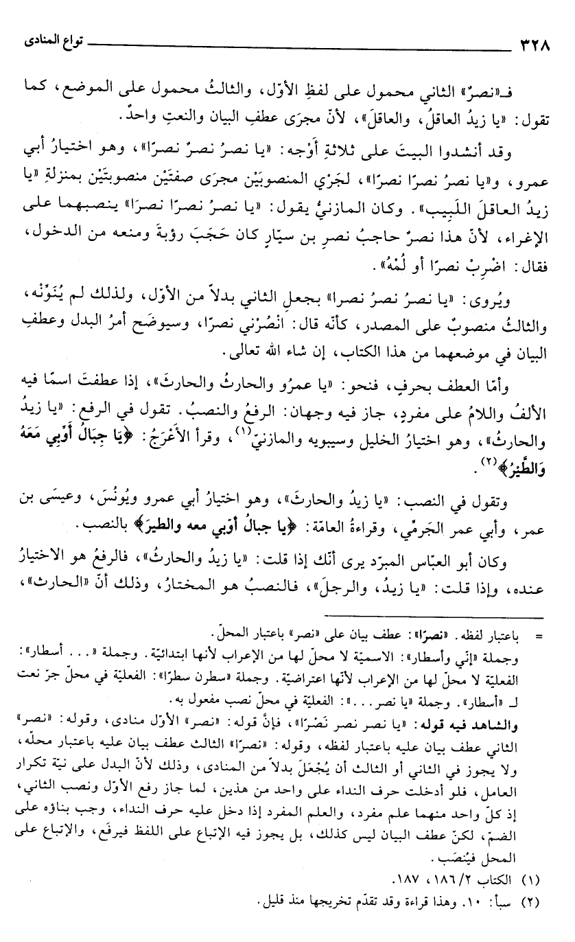 وتقول في النصب: "يا زيدُ والحارثَ"، وهو اختيارُ أبي عمرو ويُونُسَ، وعيسَى بن عمر، وأبي عمر الجَرمّي، وقراءةُ العامّة: {يَا جِبَالُ أَوِّبِي مَعَهُ وَالطَّيْرَ} بالنصب.