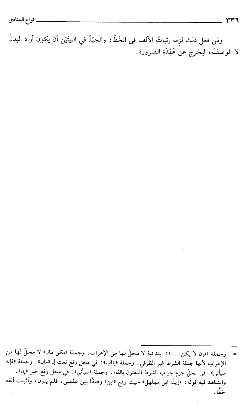 ومَن فعل ذلك لزِمه إثباتُ الألف في الخَطّ، والجيّدُ في البيتَيْن أن يكون أراد البدلَ لا الوصفَ، ليخرج عن عُهدَةِ الضرورة.