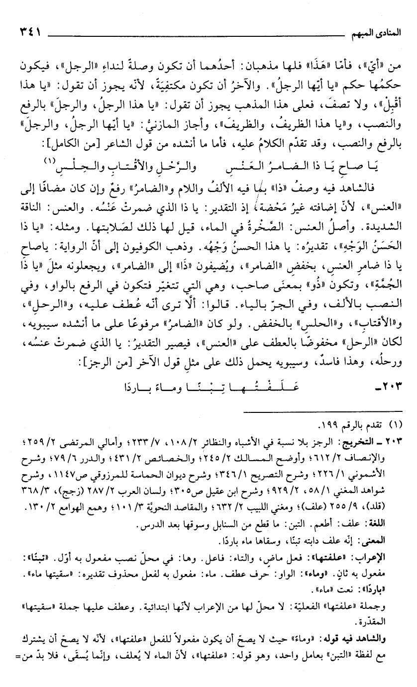 203 - التخريج: الرجز بلا نسبة في الأشباه والنظائر 2/ 108، 7/ 233؛ وأمالي المرتضى 2/ 259؛ والإنصاف 2/ 612؛ وأوضح المسالك 2/ 245؛ والخصائص 2/ 431؛ والدرر 6/ 79؛ وشرح الأشموني 1/ 226؛ وشرح التصريح 1/ 346، وشرح ديوان الحماسة للمرزوقي ص 1147، وشرح شواهد المغني 1/ 58، 2/ 929؛ وشرح ابن عقيل ص 305؛ ولسان العرب 2/ 287 (زجج)، 3/ 368 (قلد)، 9/ 255 (علف)؛ ومغني اللبيب 2/ 632؛ والمقاصد النحوية 3/ 101؛ وهمع الهوامع 2/ 130.