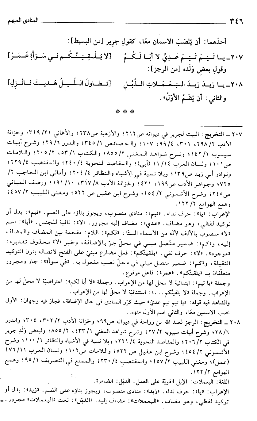 والشاهد فيه قوله: "يا تيم تيم عديّ" حيث كرّر المنادى في حال الإضافة، فجاز فيه وجهان: الأول نصب الاسمين معًا، والثاني ضم الأول منهما.