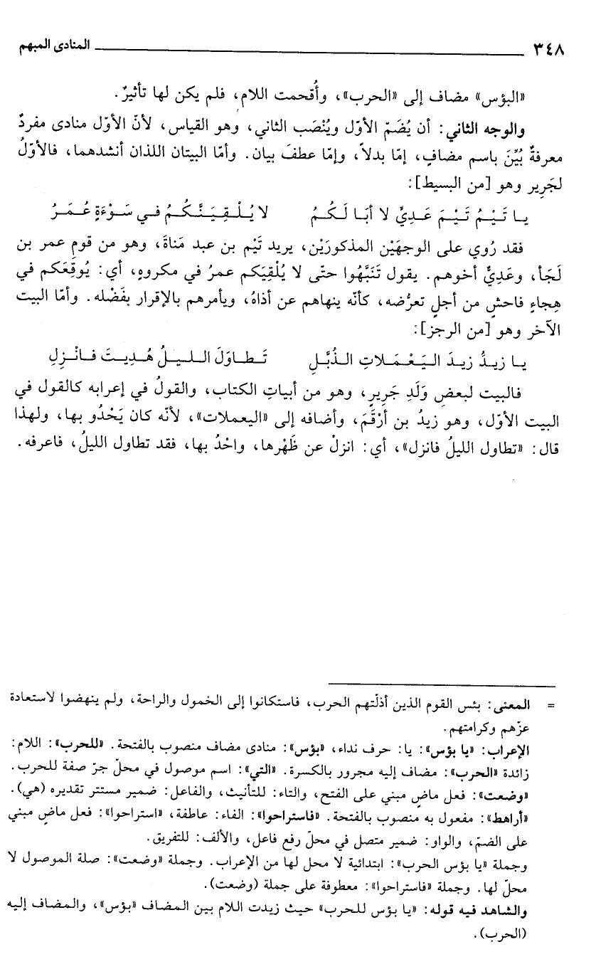 والوجه الثاني: أن يُضَمّ الأوّل ويُنْصَب الثاني، وهو القياس, لأنّ الأوّل منادى مفردٌ معرفةٌ بُيِّنَ باسم مضافٍ، إمّا بدلاً، وإمّا عطفَ بيان. وأمّا البيتان اللذان أنشدهما، فالأوّلُ لجَرِير وهو [من البسيط]: