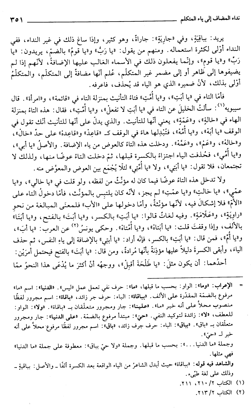 يريد: بباقِيَةٍ، وفي "جارِيَةِ": جاراةٌ، وهو كثير، وإذا ساغ ذلك في غير النداء، ففي النداء أوْلى لكثرة استعماله. ومنهم من يقول: "يا رَب" و"يا قومُ" بالضمّ، يريدون: "يا رَبِّ" و"يا قوم"، وإنّما يفعلون ذلك في الأسماء الغالب عليها الإضافةُ, لأنهم إذا لم يضيفوها إلى ظَاهر أو إلى مضمر غير المتكلّم، عُلم أنّها مضافةٌ إلى المتكلّم، والمتكلّمُ أوْلى بذلك, لأنّ ضميره الذي هو الياء قد يُحذف، فاعرفه.