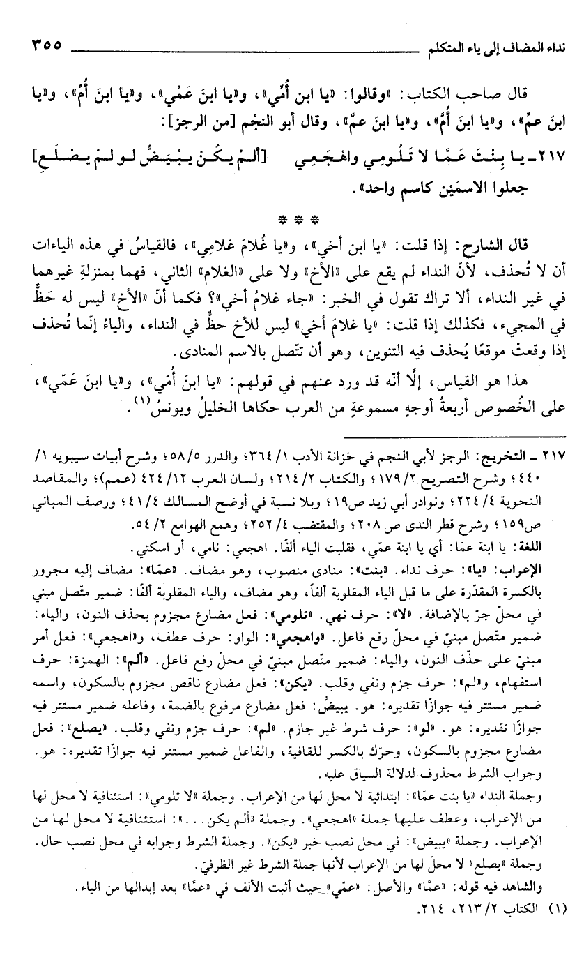 217 - التخريج: الرجز لأبي النجم في خزانة الأدب 1/ 364؛ والدرر 5/ 58؛ وشرح أبيات سيبويه 1/ 440؛ وشرح التصريح 2/ 179؛ والكتاب 2/ 214؛ ولسان العرب 12/ 424 (عمم)؛ والمقاصد النحوية 4/ 224؛ ونوادر أبي زيد ص 19؛ وبلا نسبة في أوضح المسالك 4/ 41؛ ورصف المباني ص 159؛ وشرح قطر الندى ص 208؛ والمقتضب 4/ 252؛ وهمع الهوامع 2/ 54.
