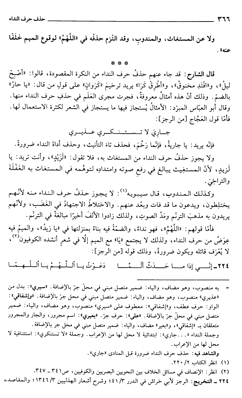 فإنّه يريد: يا جاريةُ، فإنّما رَخَّمَ، فحذف تاءَ التأنيث، وحذف أداةَ النداء ضرورةً. ولا يجوز حذفُ حرف النداء من المستغاث به، فلا تقول: "لَزَيْدٍ"، وأنت تريد: يا لَزيدٍ, لأن المستغِيث يبالغ في رفعِ صوته وامتداده لتوهُّمه في المستغاث به الغَفْلَةَ والتراخِيَ.