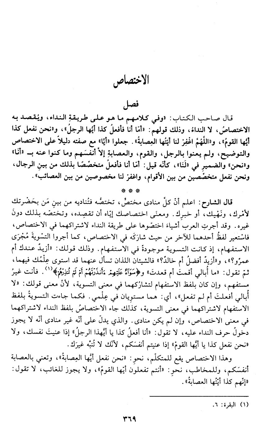 قال الشارح: اعلم أنّ كلَّ منادى مختصٌّ، تختصُّه فتُناديه من بينِ مَن بحَضْرتك لأمْرك، ونَهْيك، أو خبرِك. ومعنَى اختصاصك إياه أن تقصِده، وتختصّه بذلك دونَ غيره. وقد أجرتِ العرب أشياءَ اختصّوها على طريقة النداء لاشتراكهما في الاختصاص، فاسْتعير لفظُ أحدهما للآخر من حيث شارَكَه في الاختصاص، كما أجروا التسْويةَ مُجْرَى الاستفهام، إذ كانت التسوية موجودةً في الاستفهام. وذلك قولك: "أزيدٌ عندك أم عمرٌو؟ "، و"أزيدٌ أفضلُ أم خالدٌ؟ " فالشيئان اللذان تسأل عنهما قد استوى عِلْمُك فيهما، ثمّ تقول: "ما أُبالي أقمتَ أم قعدتَ" و {سَوَاءٌ عَلَيْهِمْ أَأَنْذَرْتَهُمْ أَمْ لَمْ تُنْذِرْهُمْ} (¬1). فأنت غيرُ مستفهم، وإن كان بلفظ الاستفهام لتشارُكهما في معنى التسوية، لأنّ معنى قولك: "لا أُبالي أفعلتَ أم لم تفعل"، أي: هما مستوِيان في عِلْمىِ. فكما جاءت التسويةُ بلفظ الاستفهام لاشتراكهما في معنى التسوية، كذلك جاء الاختصاصُ بلفظ النداء لاشتراكهما في معنى الاختصاص، وإن لم يكن منادى. والذي يدلّ على أنّه غير منادى أنّه لا يجوز دخولُ حرف النداء عليه، لا تقول: "أنا أفعلُ كذا يا أيُّهذا الرجلُ" إذا عنيتَ نفسك، ولا "نحن نفعل كذا يا أيُّها القومْ" إذا عنيتم أنفسَكم، لأنّك لا تُنبِّه غيرَك.